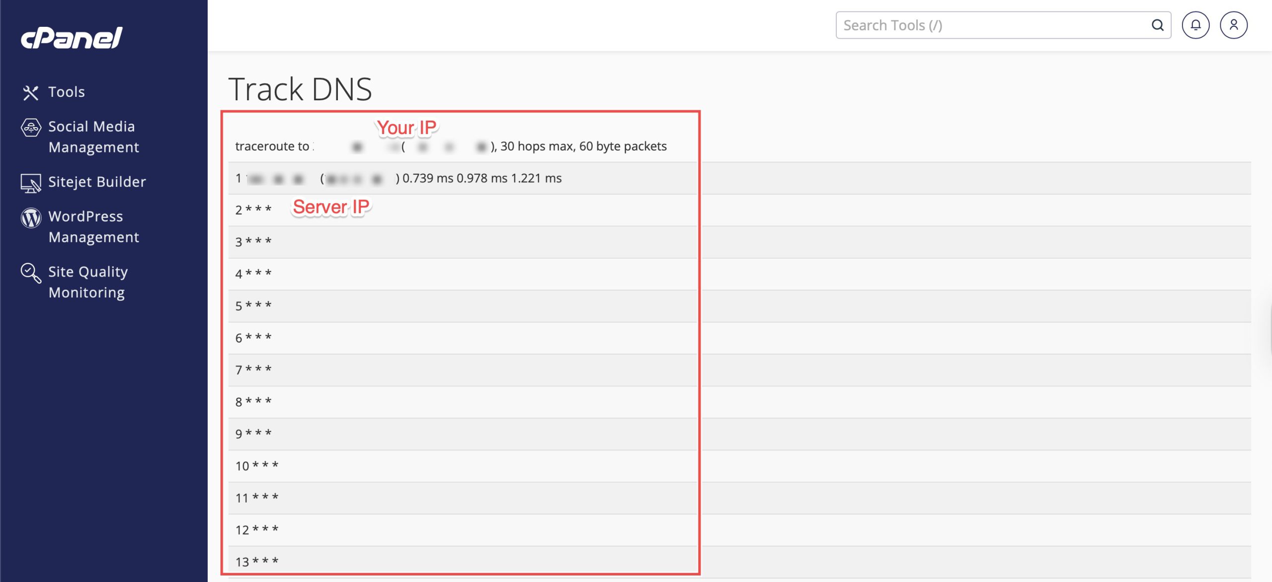 Performing traceroute analysis through cPanel’s Track DNS interface provides valuable diagnostic information for troubleshooting network connectivity and performance issues. By examining the complete network path and response times at each hop, you can identify bottlenecks, routing problems, or connectivity failures affecting access to your server.