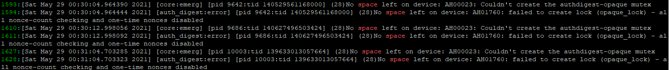 When managing Apache HTTP Server (httpd) on a Linux-based system, encountering startup failures accompanied by errors such as Couldn’t create the authdigest-opaque mutex  or No space left on device can indicate underlying issues with system-level semaphore limits. Apache may fail to start and log errors like the following: