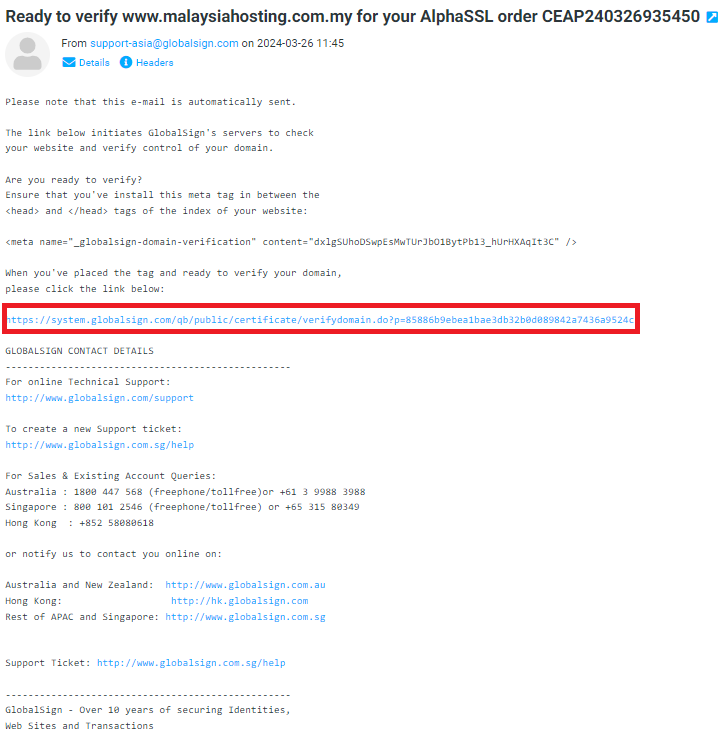 - You can find a meta tag in the email. Follow the guide to install the meta tag in your website. After the meta tag added, click the hyperlink in the email to verify the domain.