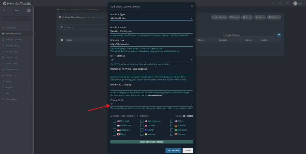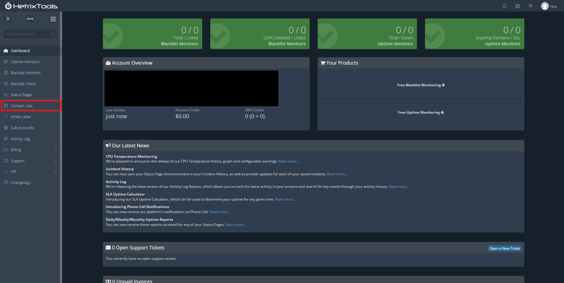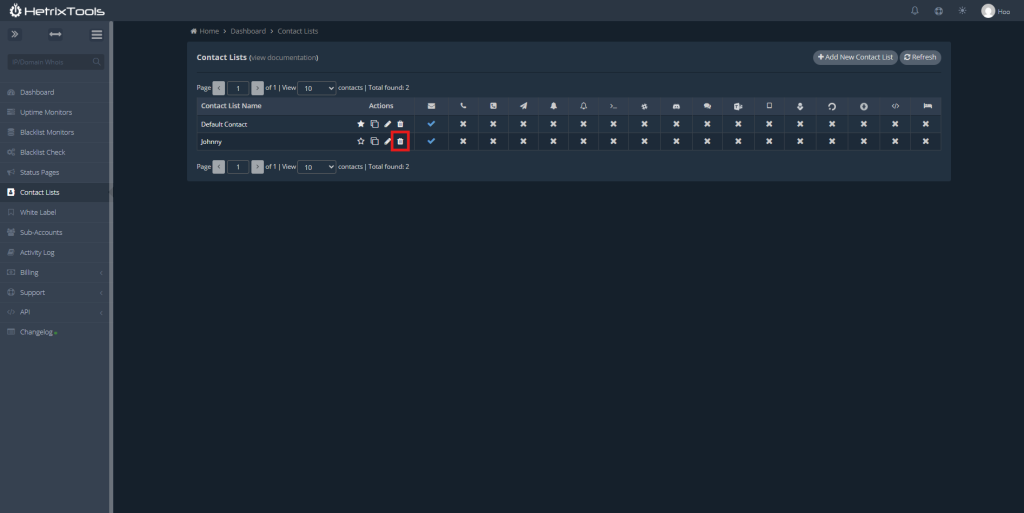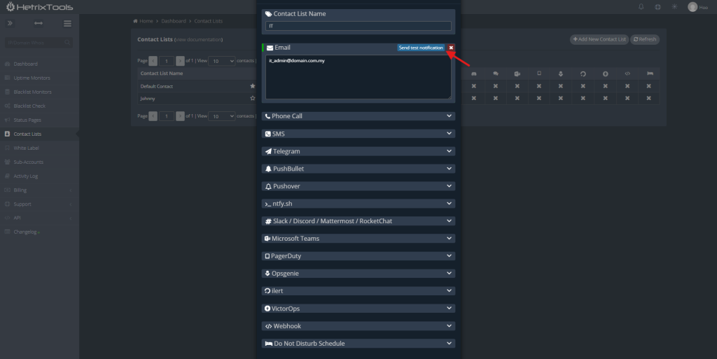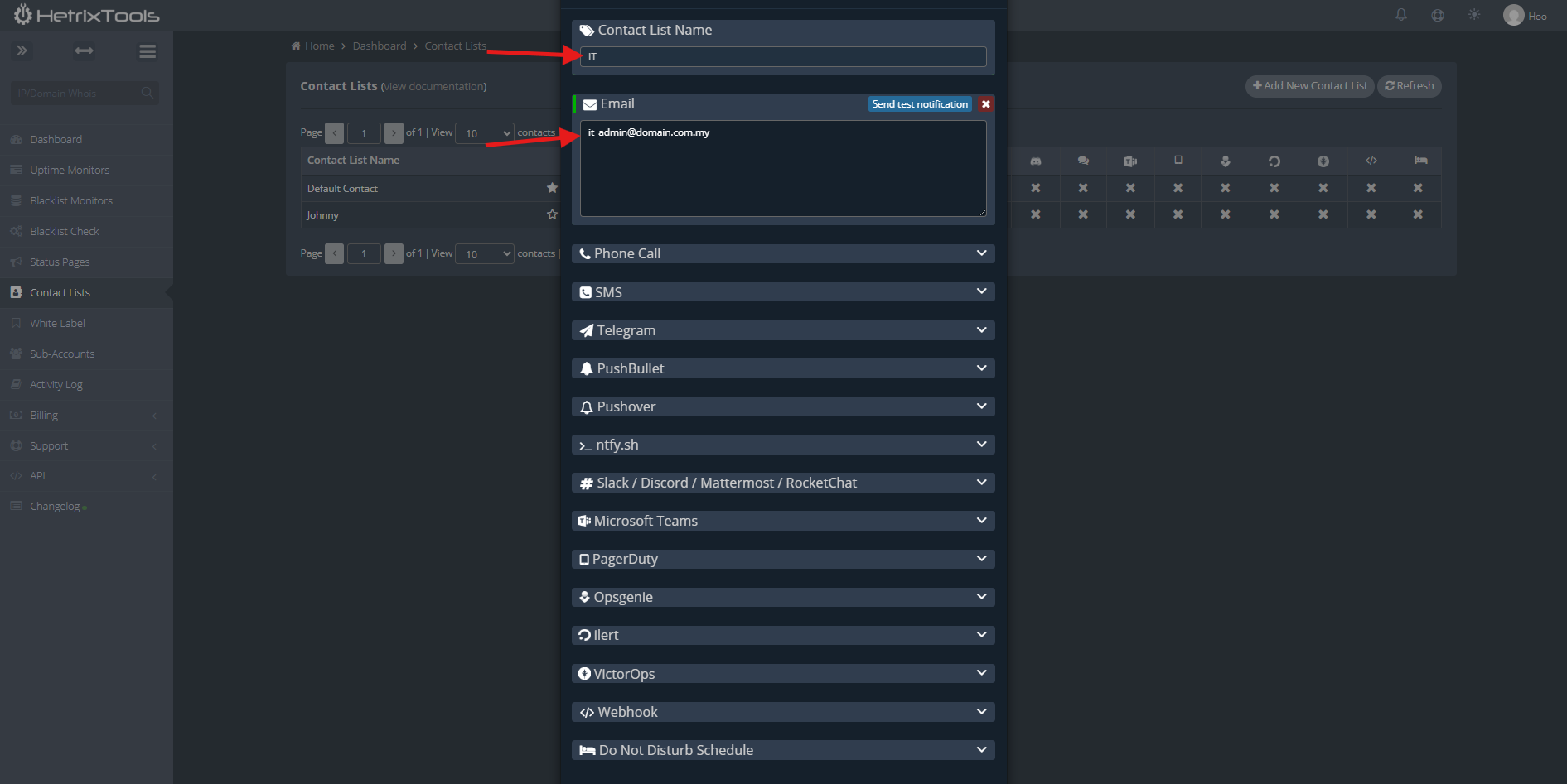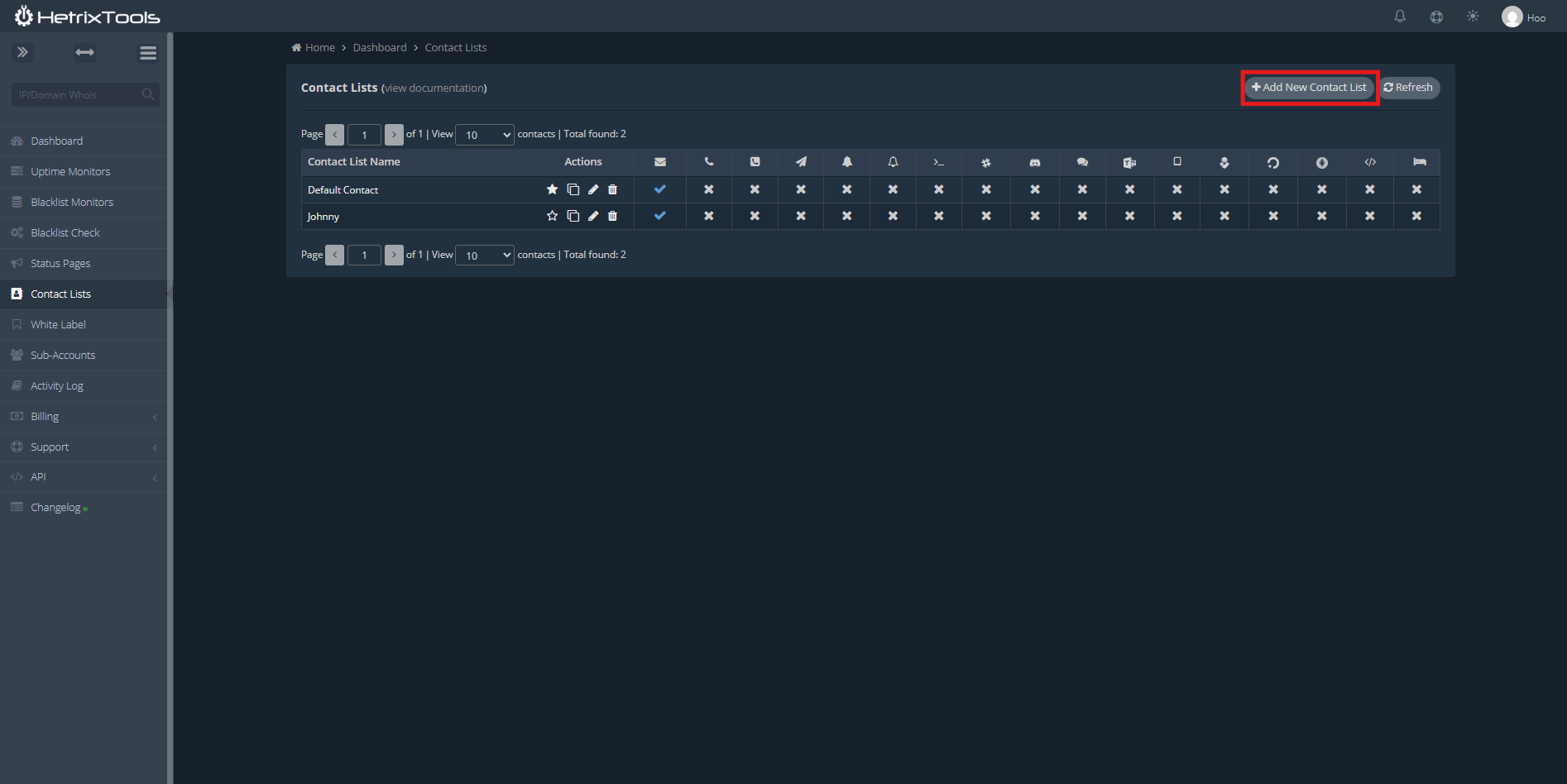 Important Note ⚠️: Using free account on HetrixTools may have some limitation on managing the Contact Lists.