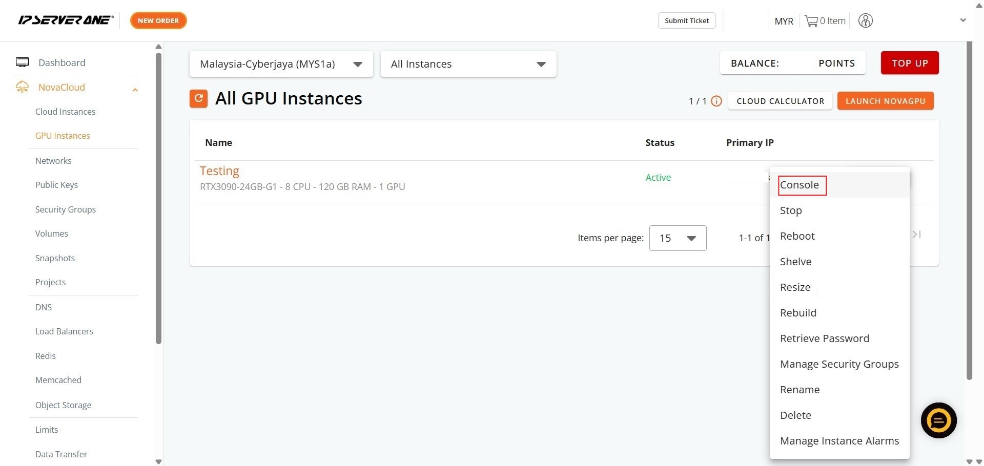 - From the expanded NovaCloud menu, locate and Click GPU Instances.