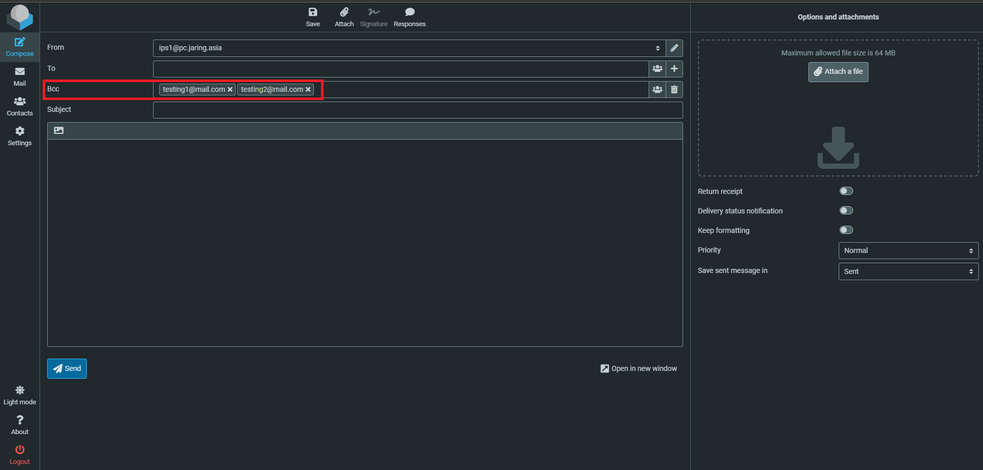 - You can try to compose an email, and can see that emails that we have add before already BCC by default