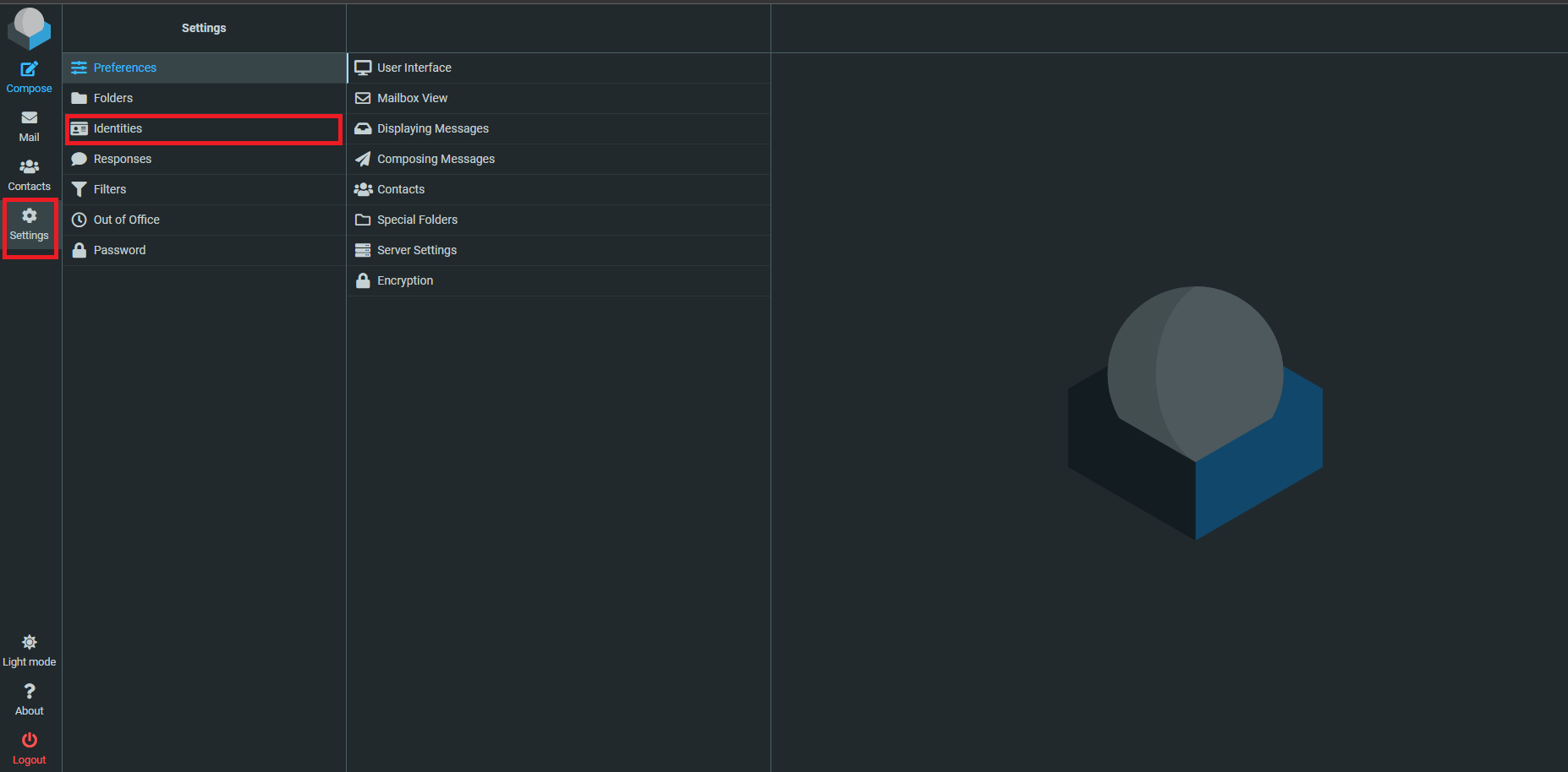 - Once you login to the Roundcube, on the left tab click on Settings, then click on Identities