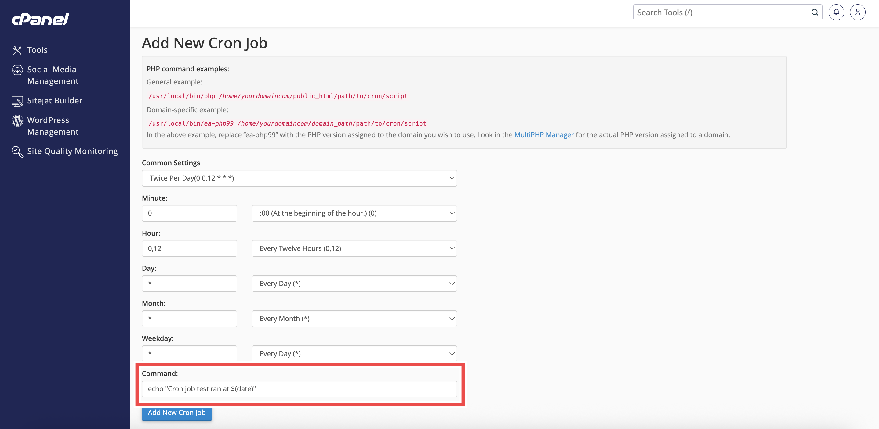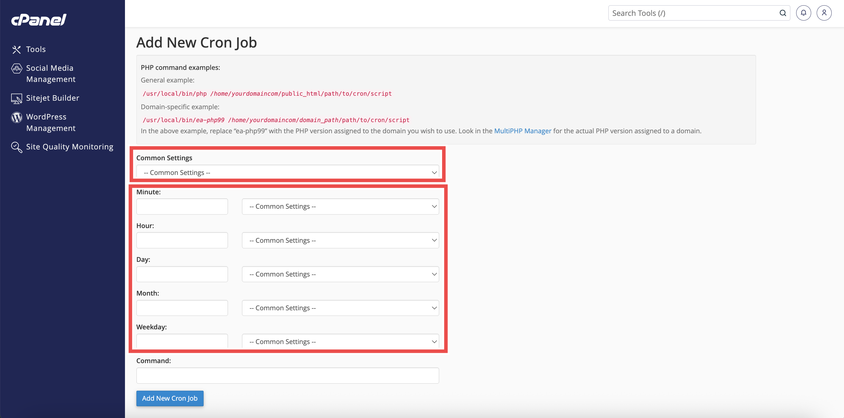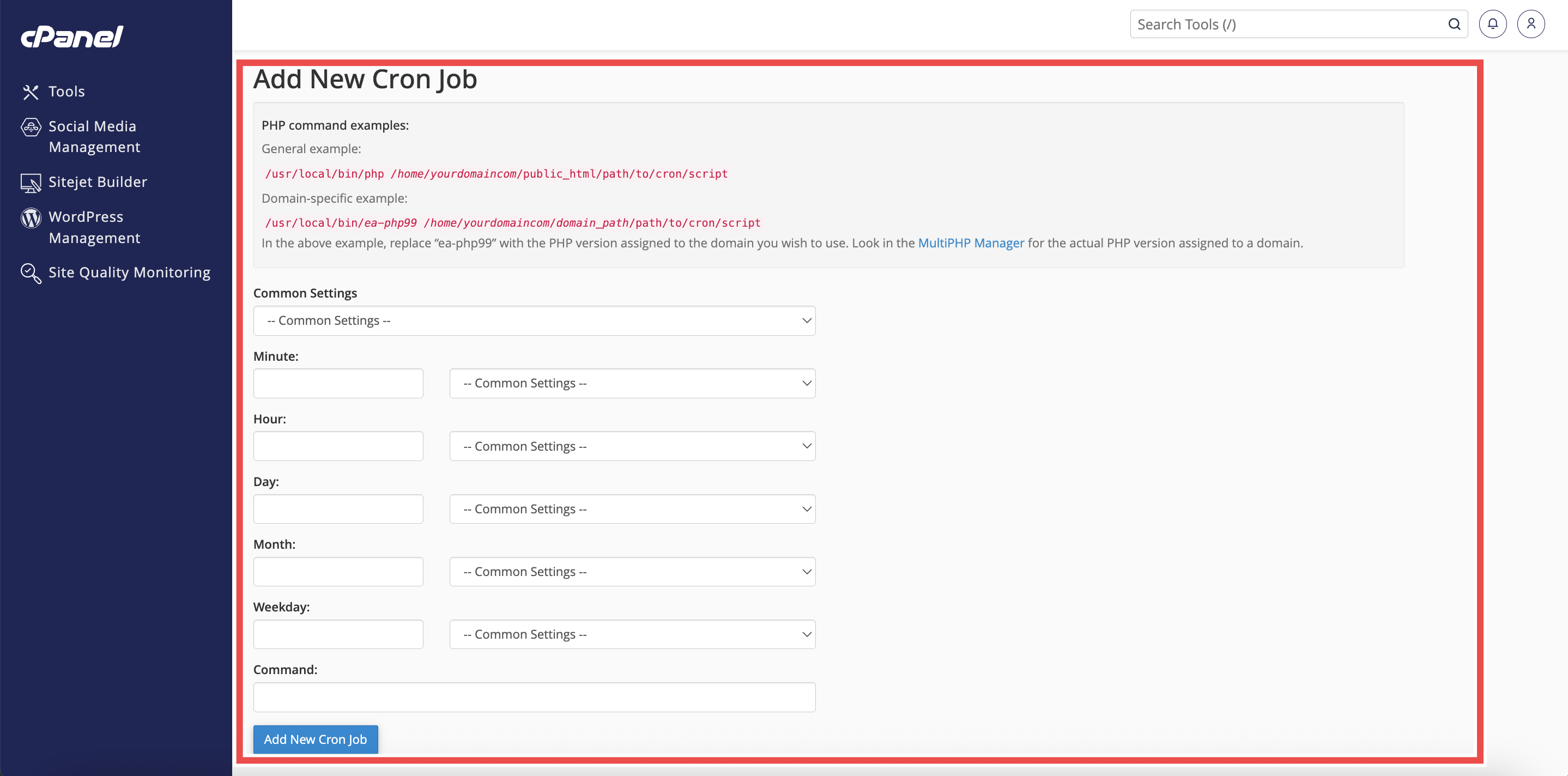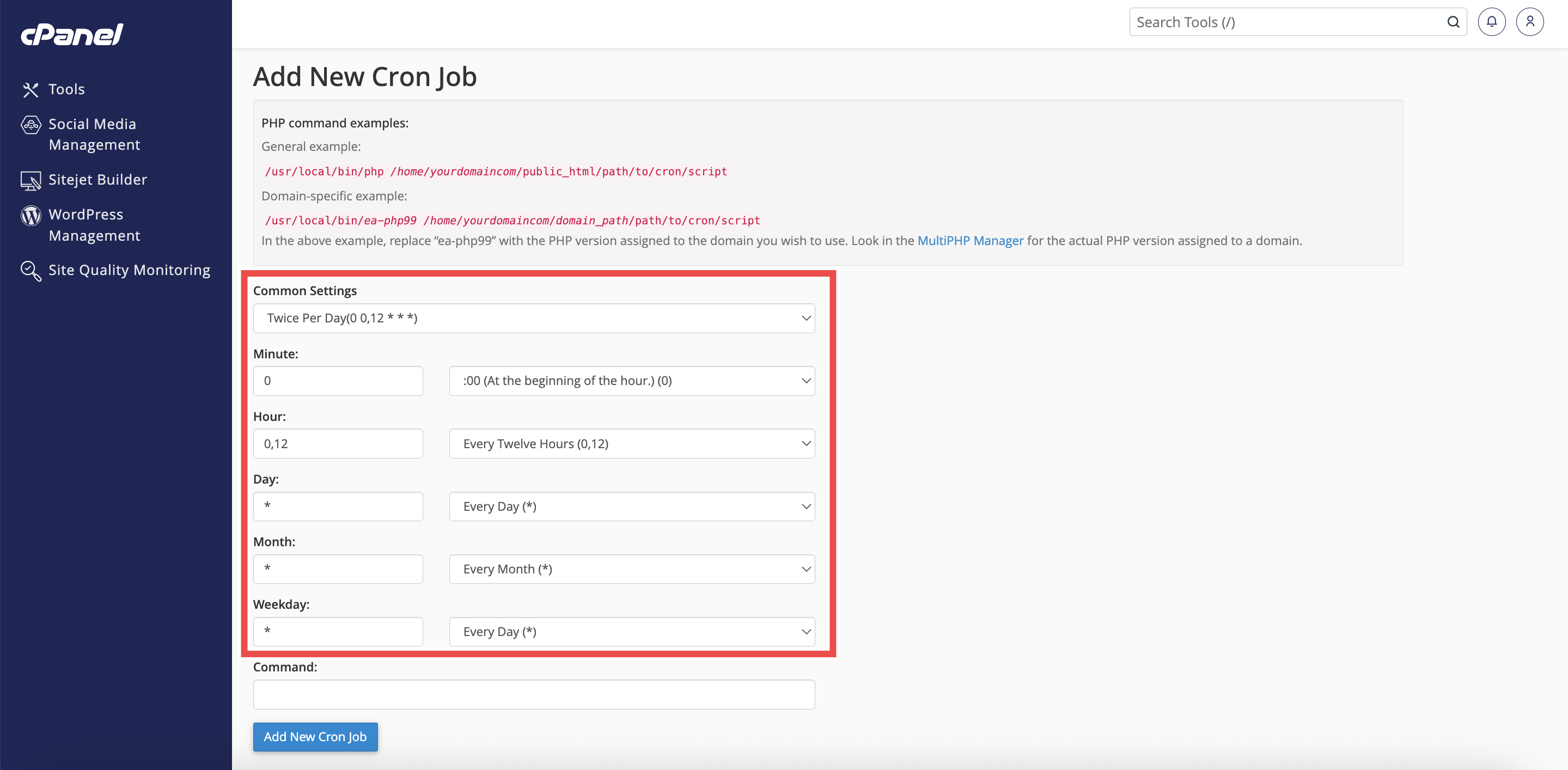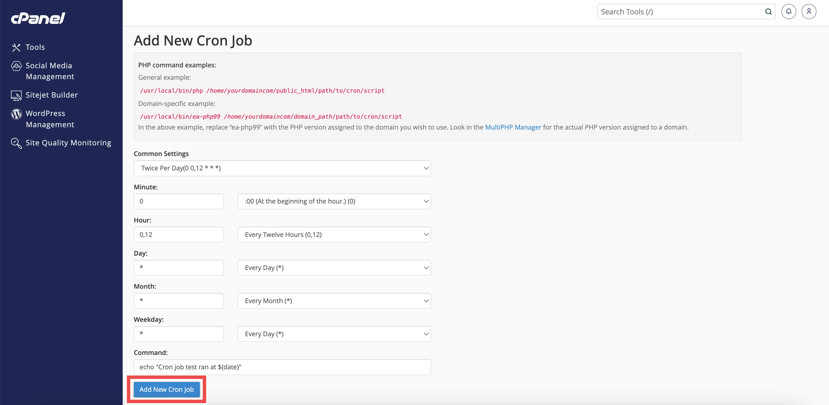 By following these steps, a new cron job can be easily added and scheduled in cPanel. This allows automated tasks to run at the desired intervals without manual intervention. Regular monitoring of the Current Cron Jobs table ensures that all scheduled tasks are correctly configured and active.