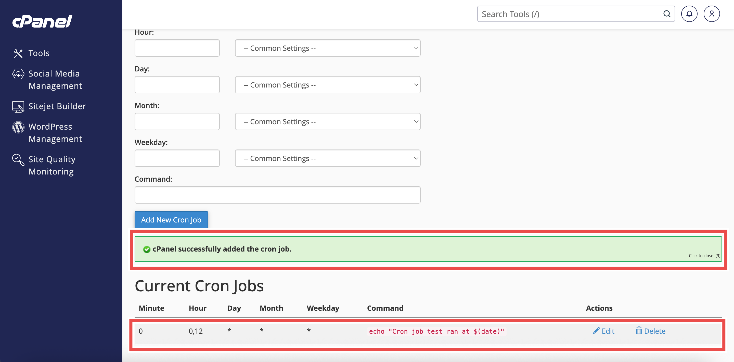 • Additionally, verify that the cron job is listed in the Current Cron Jobs table to ensure it was successfully created.
