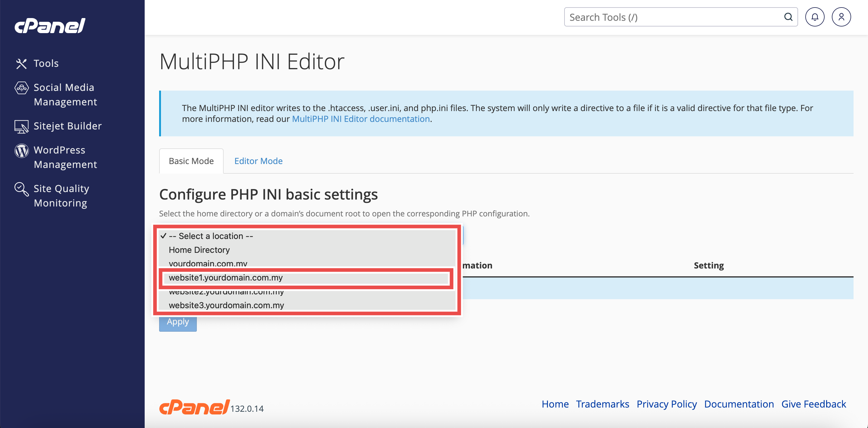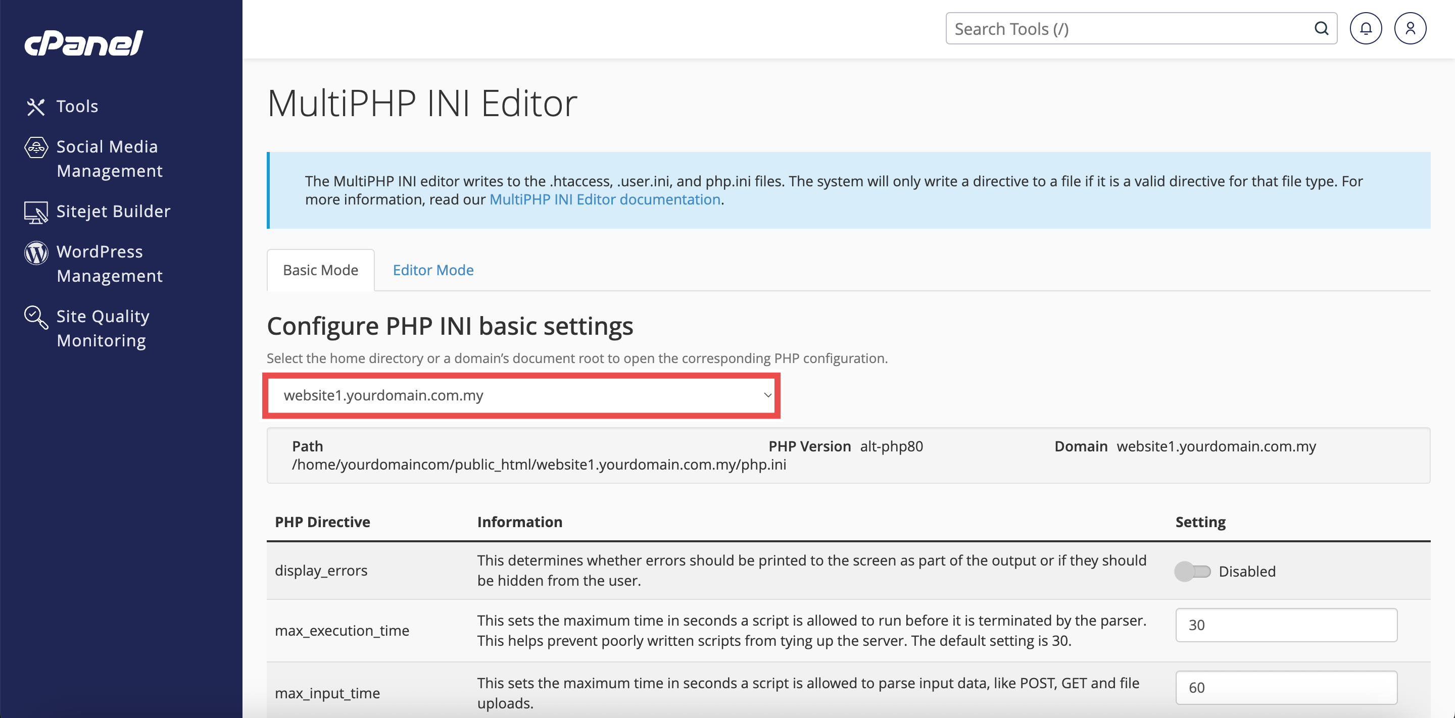 - From the Configure PHP INI basic settings dropdown menu, select the domain name for which you want to change PHP settings.