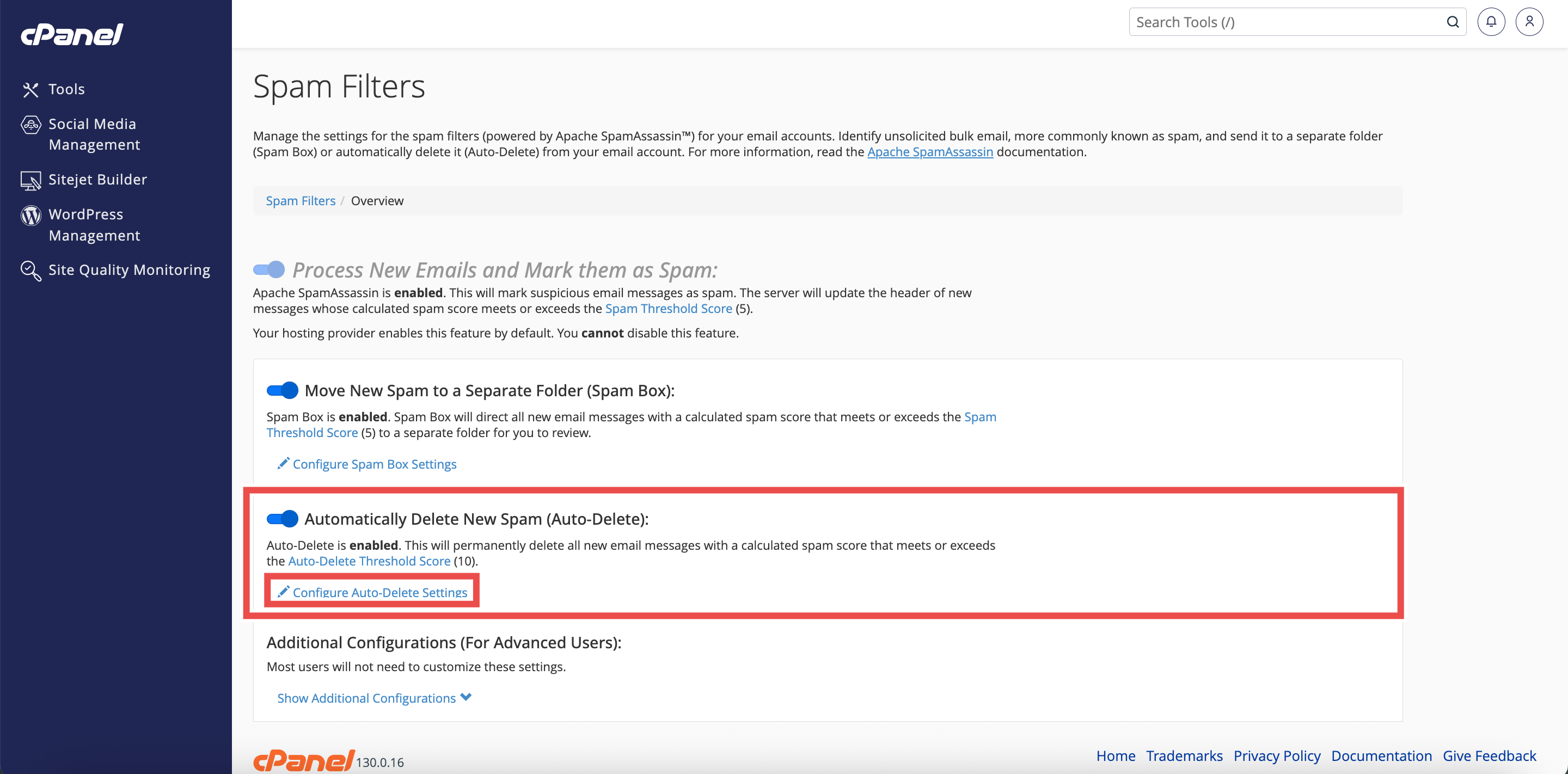 - Apache SpamAssassin and Auto-Delete feature must be enabled.