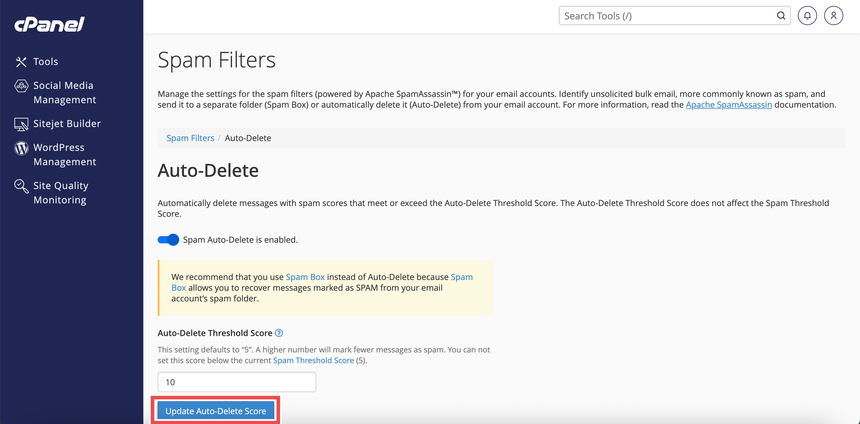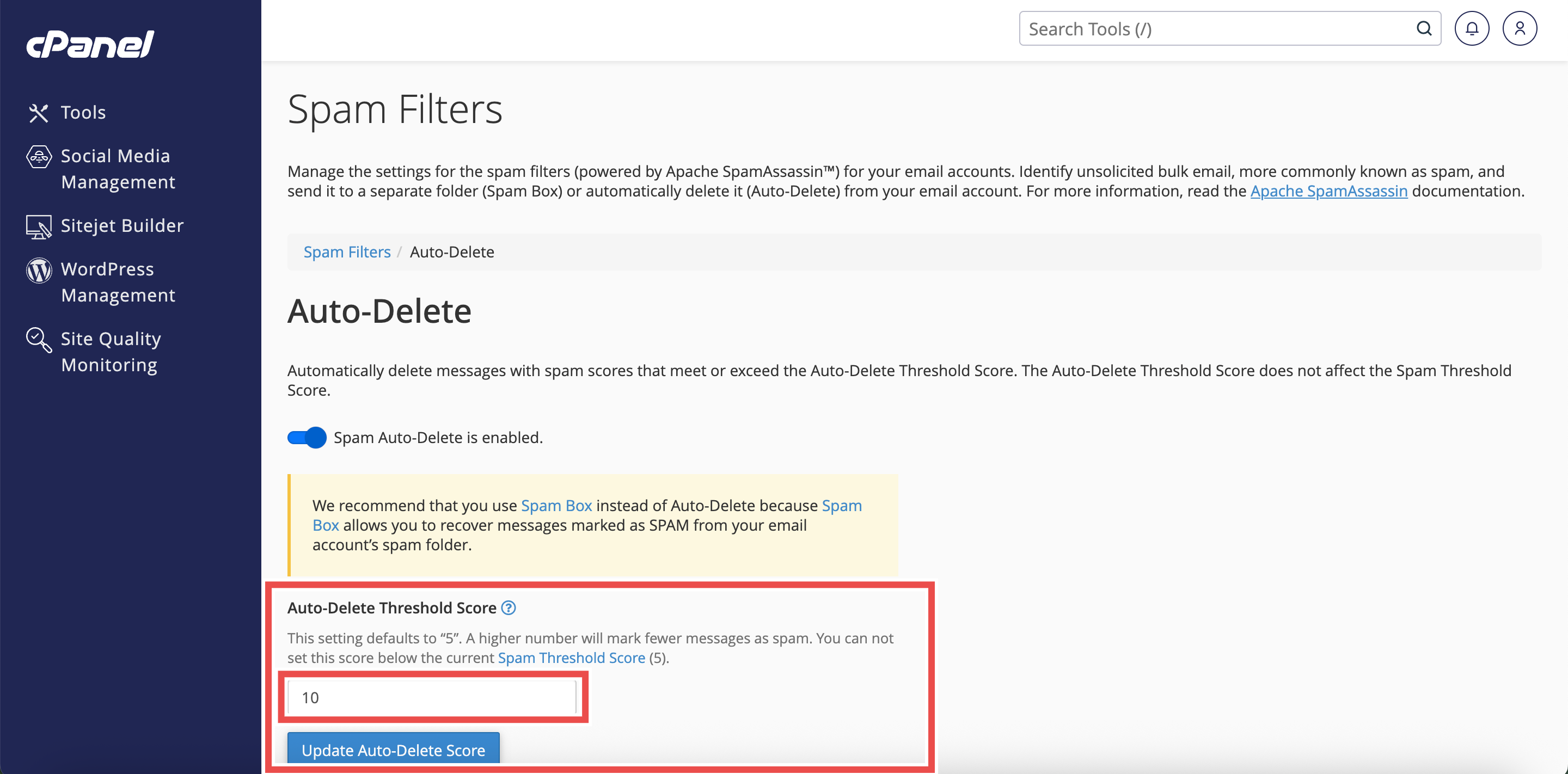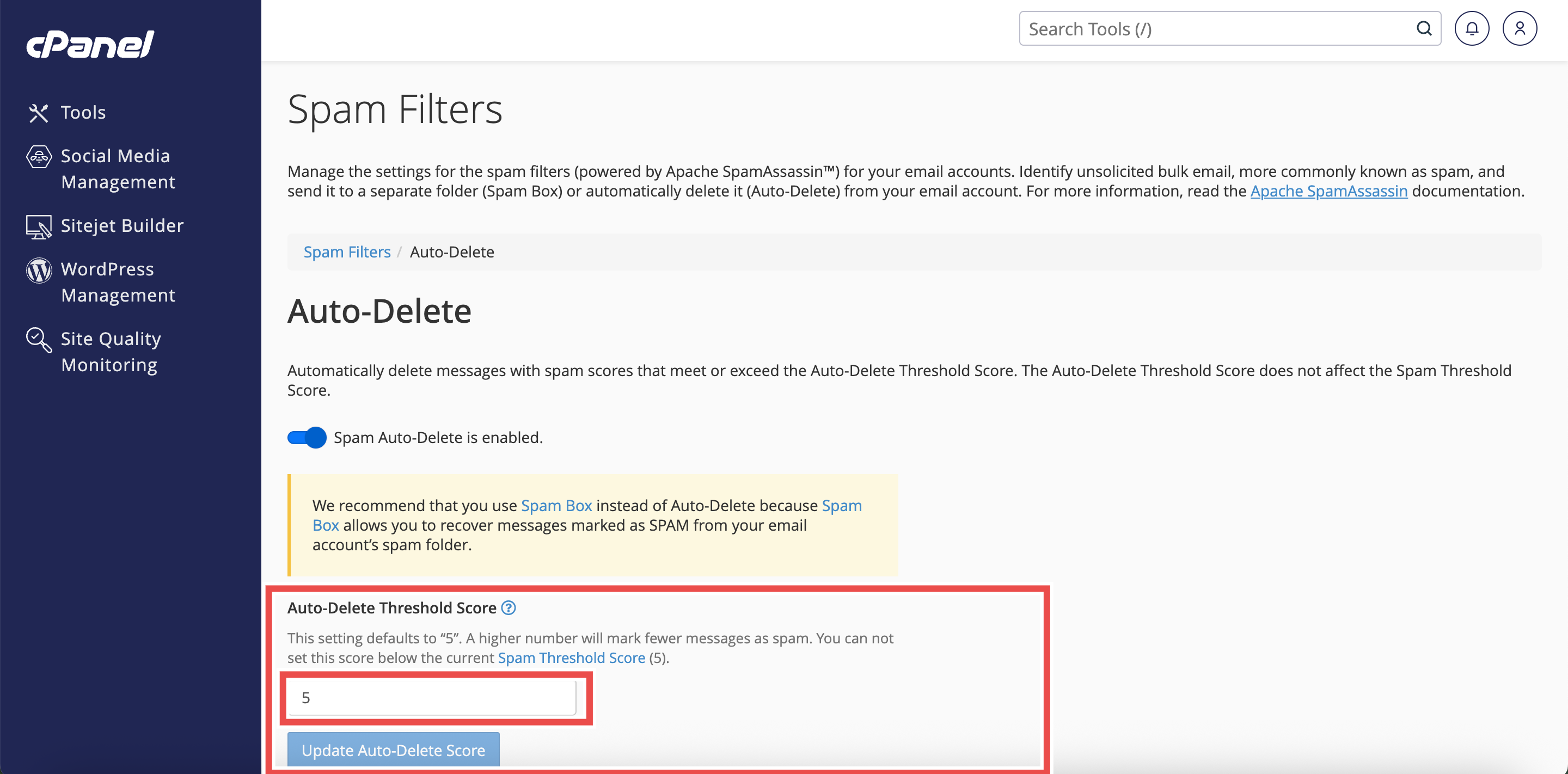 How to Adjust the Auto-Delete Threshold Score using Spam Filters in cPanel
