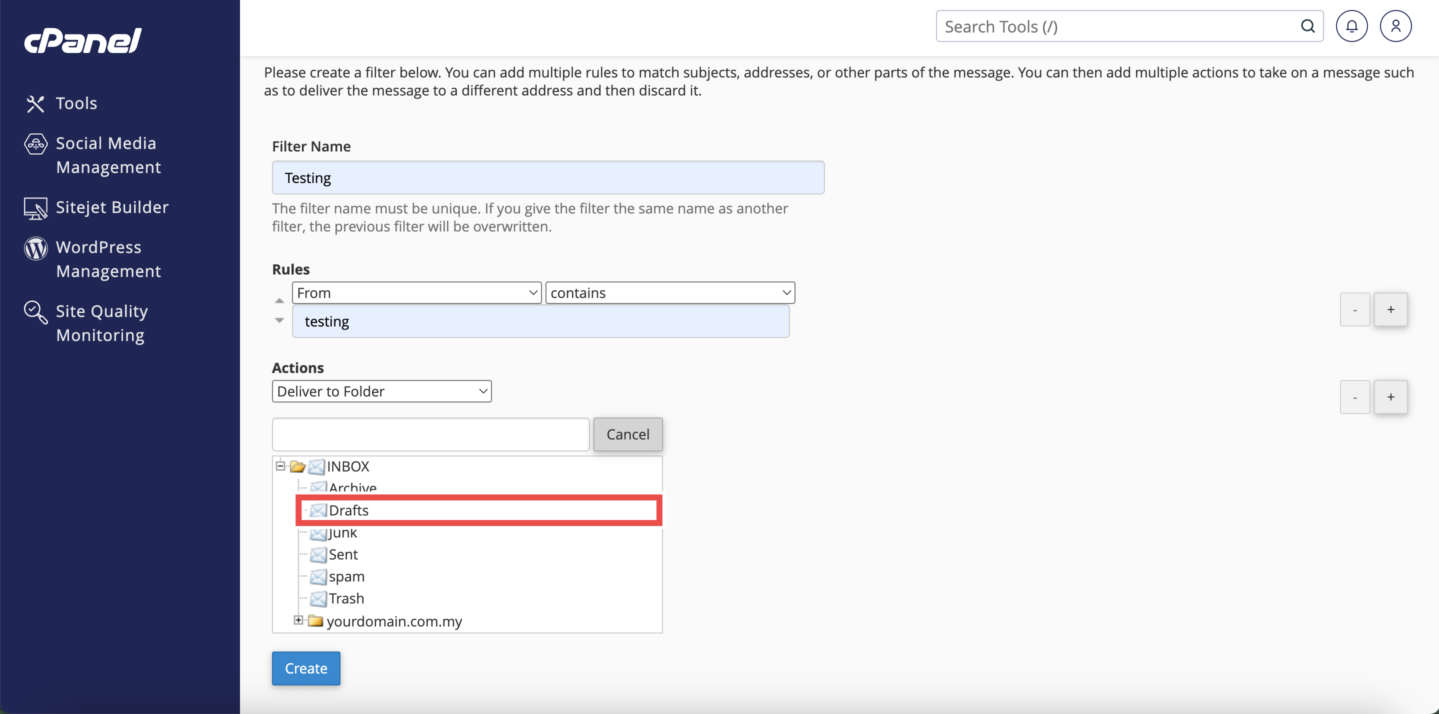 By following these steps, you can automatically move emails to the Drafts folder using Email Filters in cPanel. While this is an unconventional use of the Drafts folder, it can be helpful for custom email management workflows that require temporary storage or special handling of incoming messages. Ensure the folder path is correct for your email configuration.