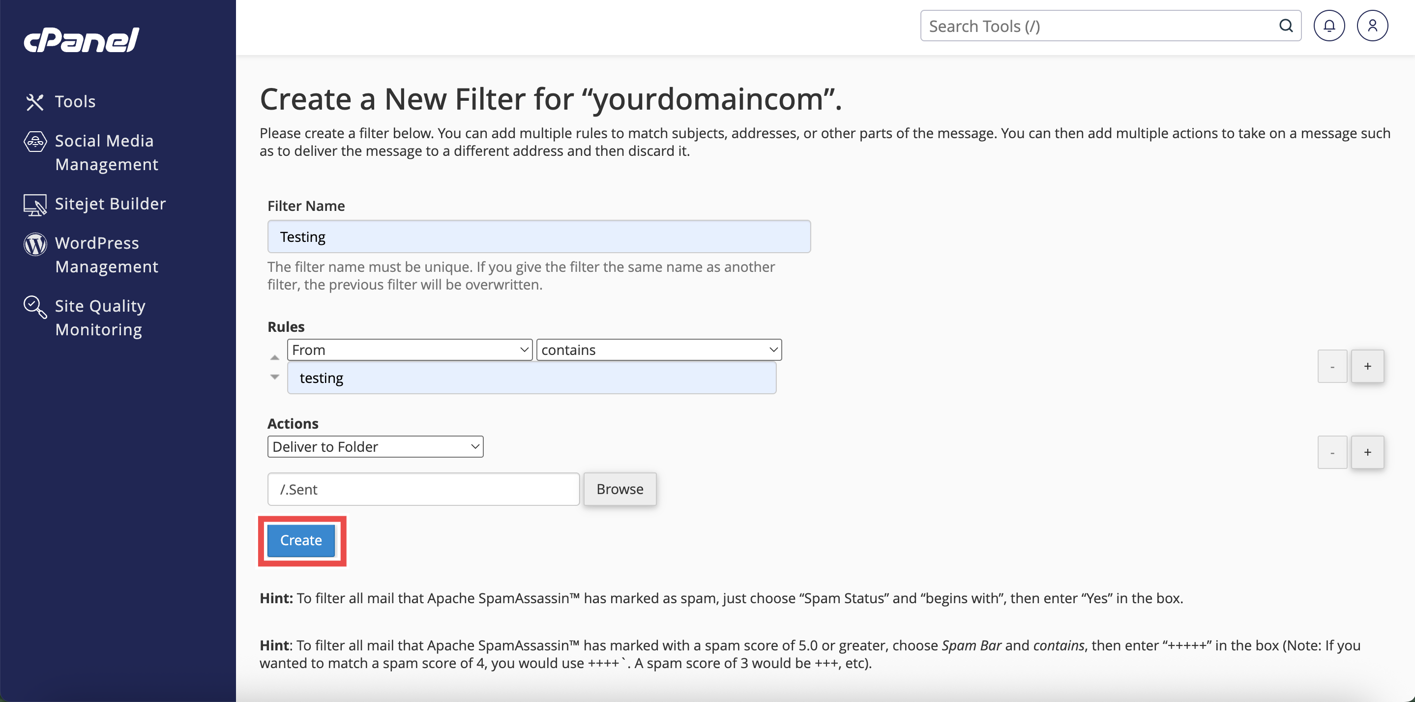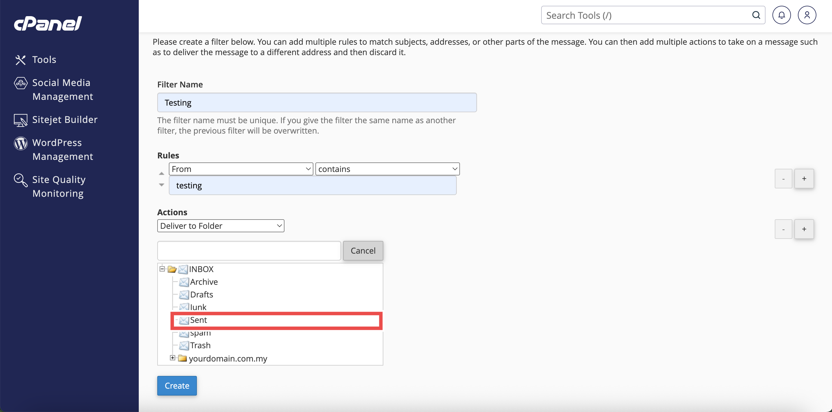 By following these steps, you can automatically move emails to the Sent folder using Email Filters in cPanel. While this is an unusual application of email filters, it may suit specific organizational workflows or archiving needs. Consider whether a custom folder might be more appropriate for your use case.