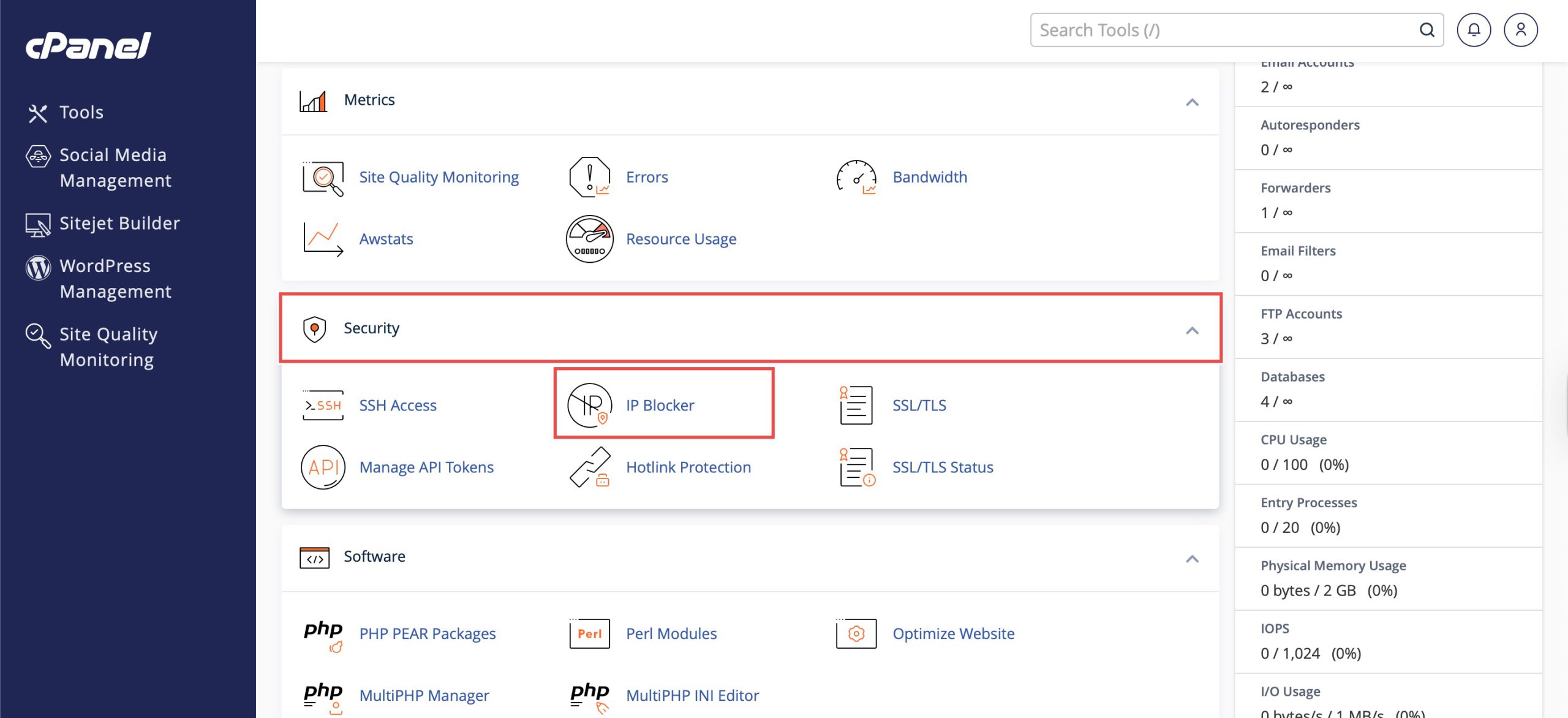 Under the Security section, click IP Blocker. You will see a feature to add IP addresses and the list of currently-blocked IP addresses.