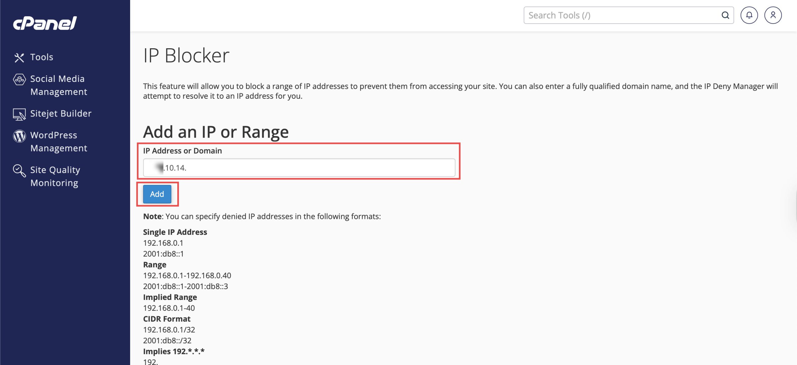 In the IP Address or Domain field, enter the address or range you want to block. You can use several formats: