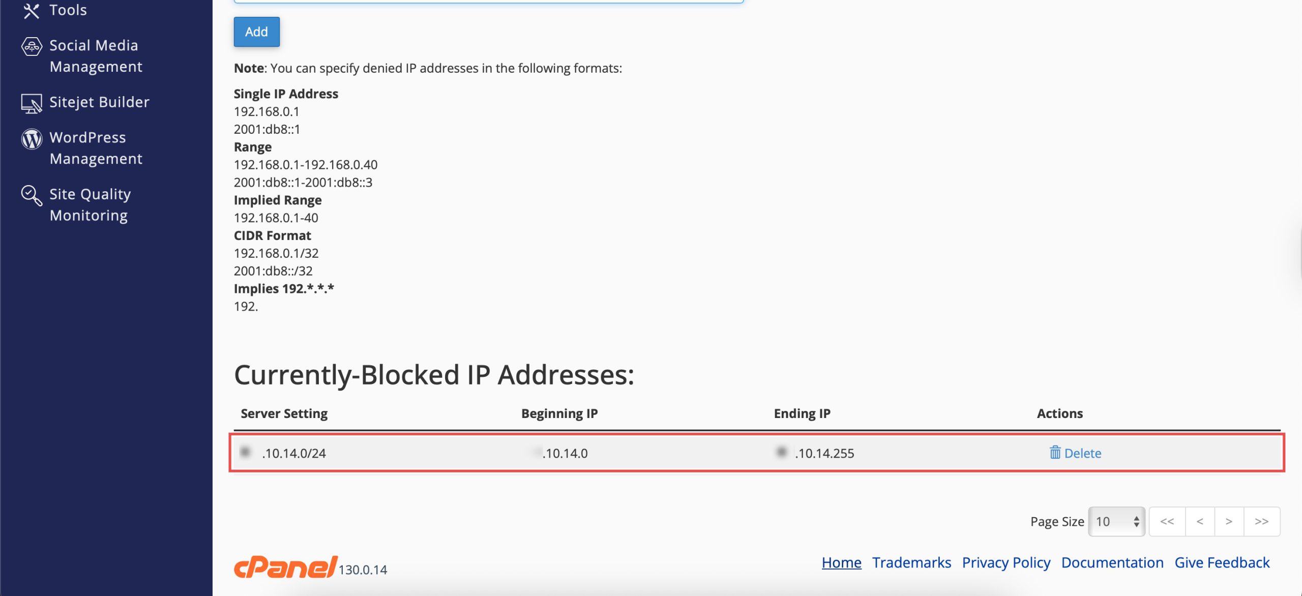 Note: The implied format (e.g., 10. ) represents 10.*.*.* and will block access to any address that begins with those numbers. Use this with extreme caution, as you could accidentally block large, legitimate networks.
