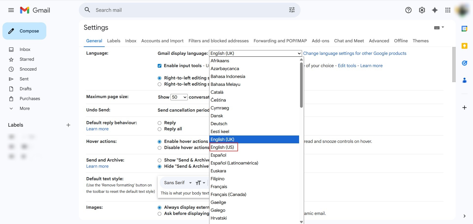 - Click the dropdown menu next to “Gmail display language” (which should currently be set to English (UK)).
