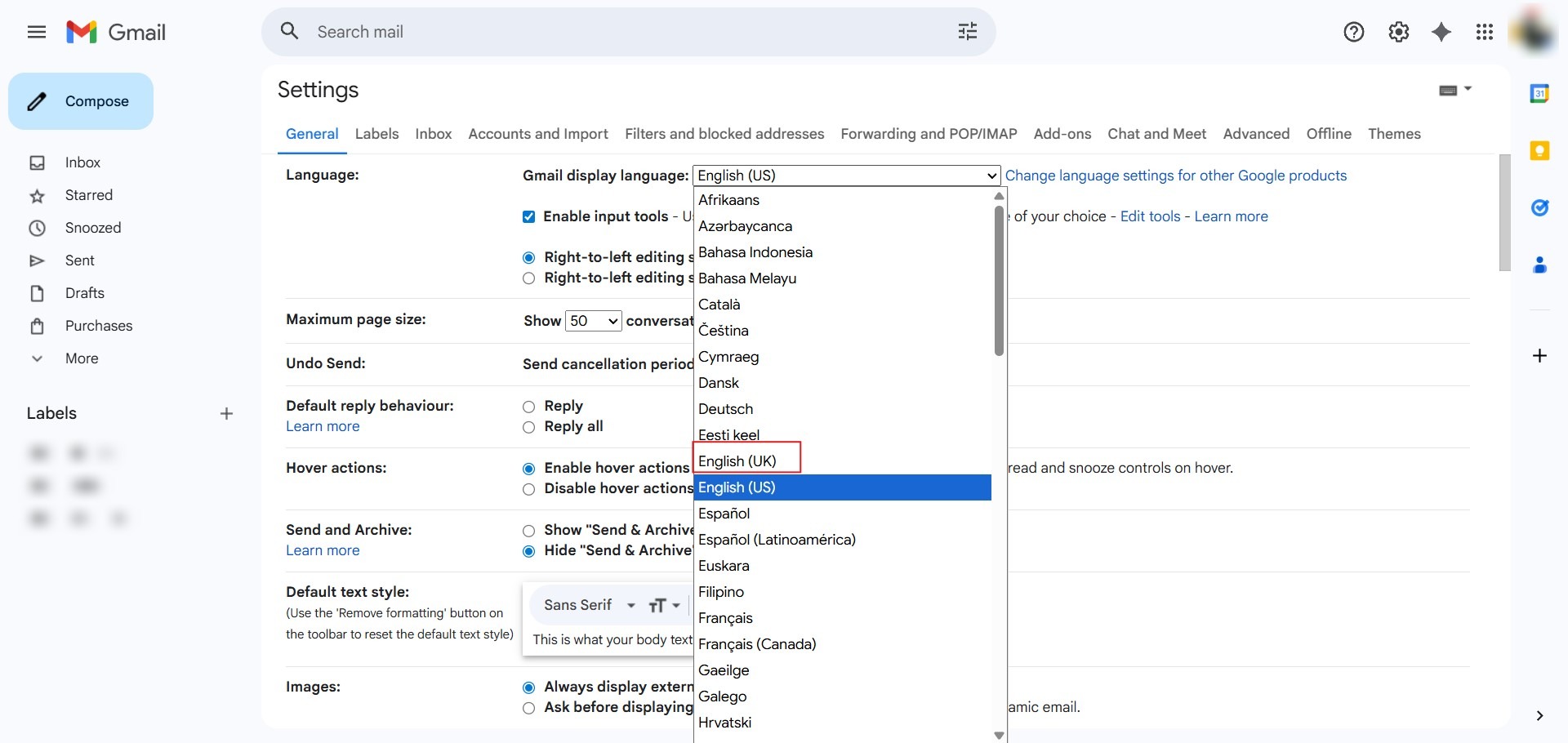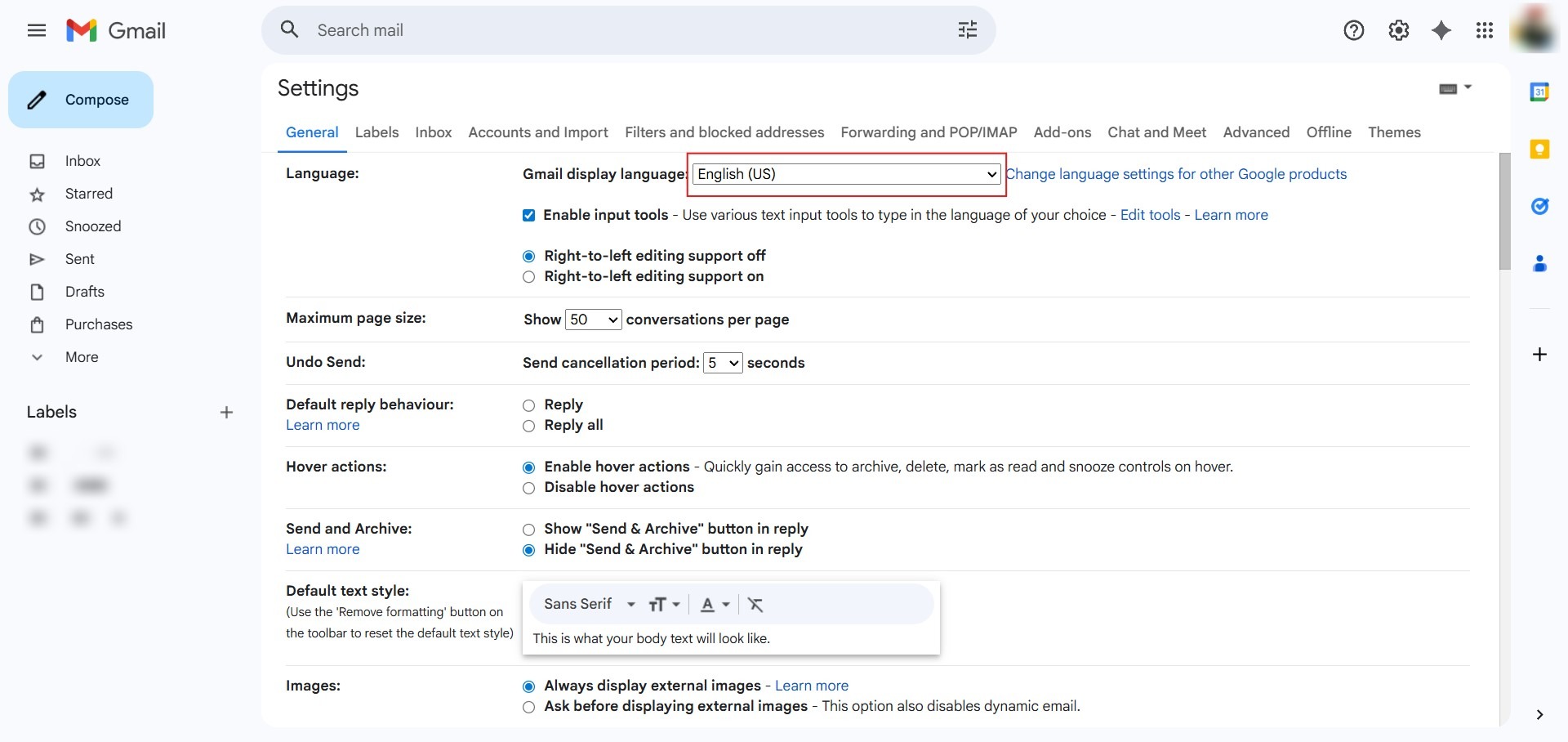 - Click the dropdown menu next to “Gmail display language” (which should currently be set to English (US)).