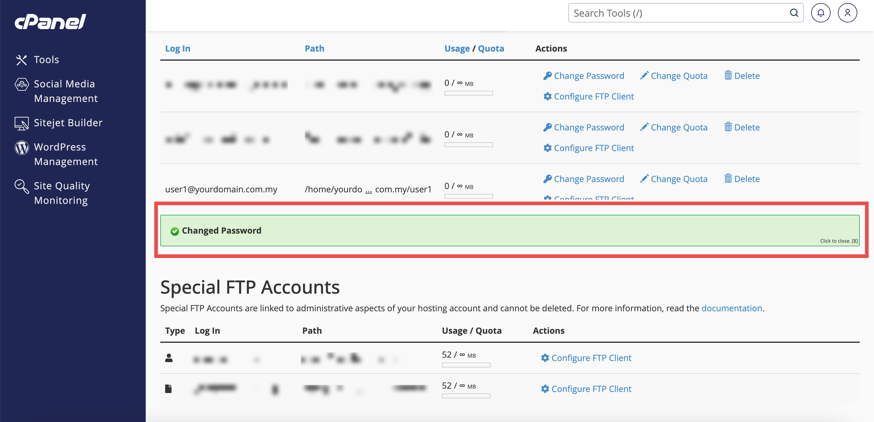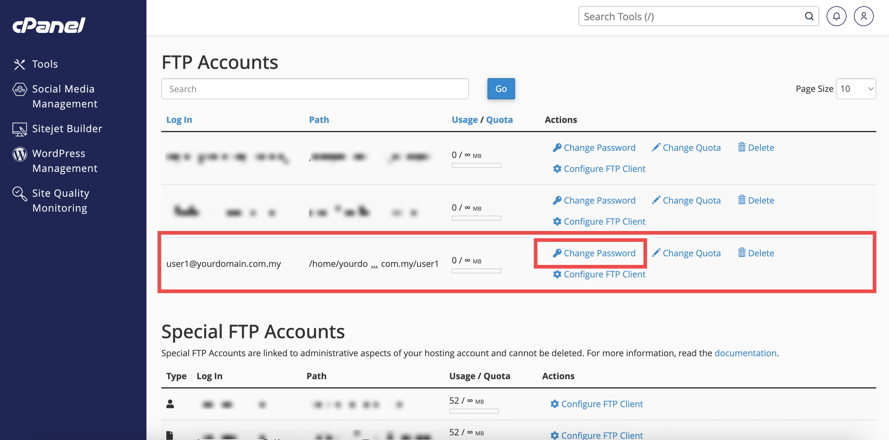 - Next to the selected FTP account, click Change Password.