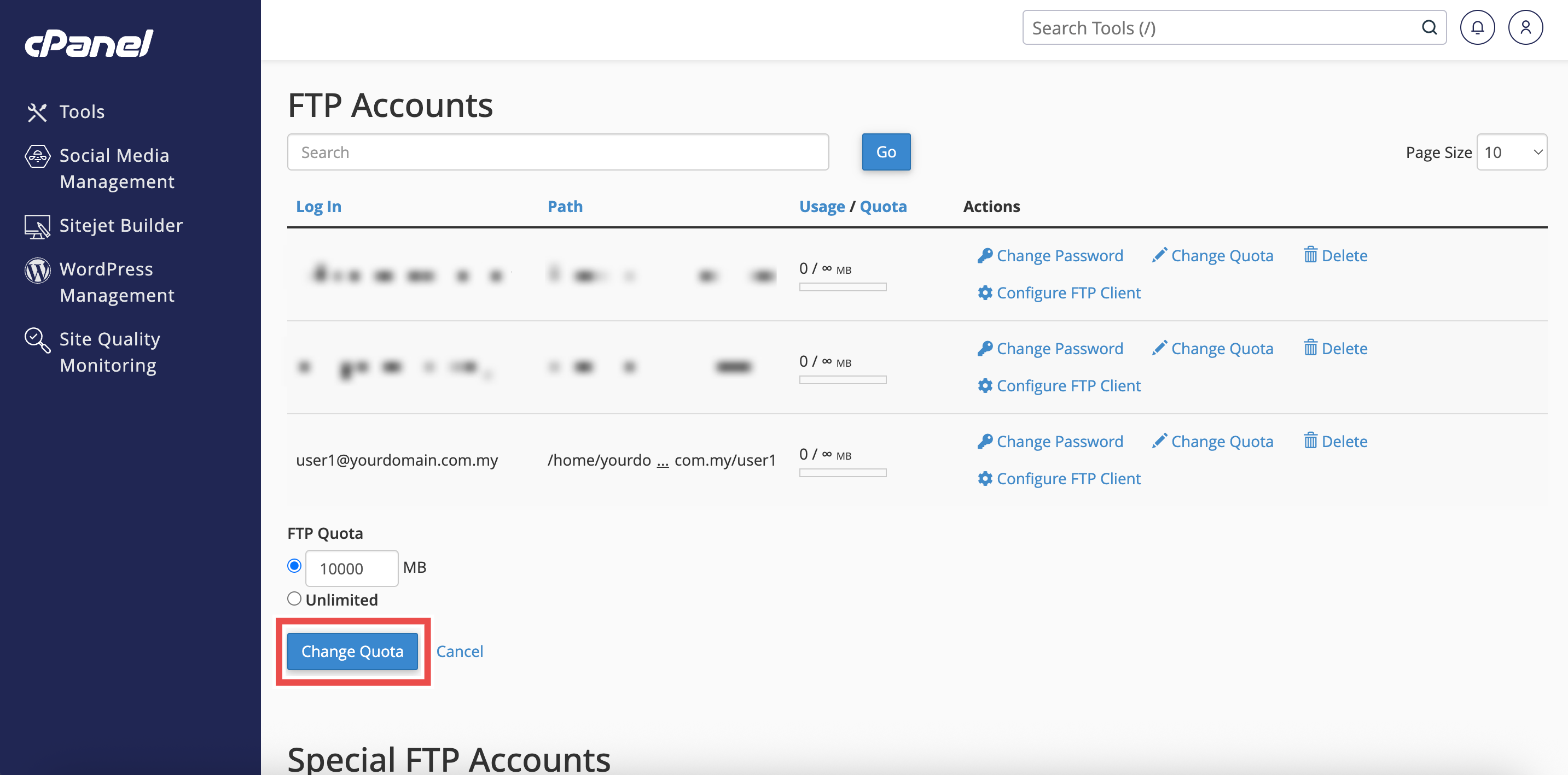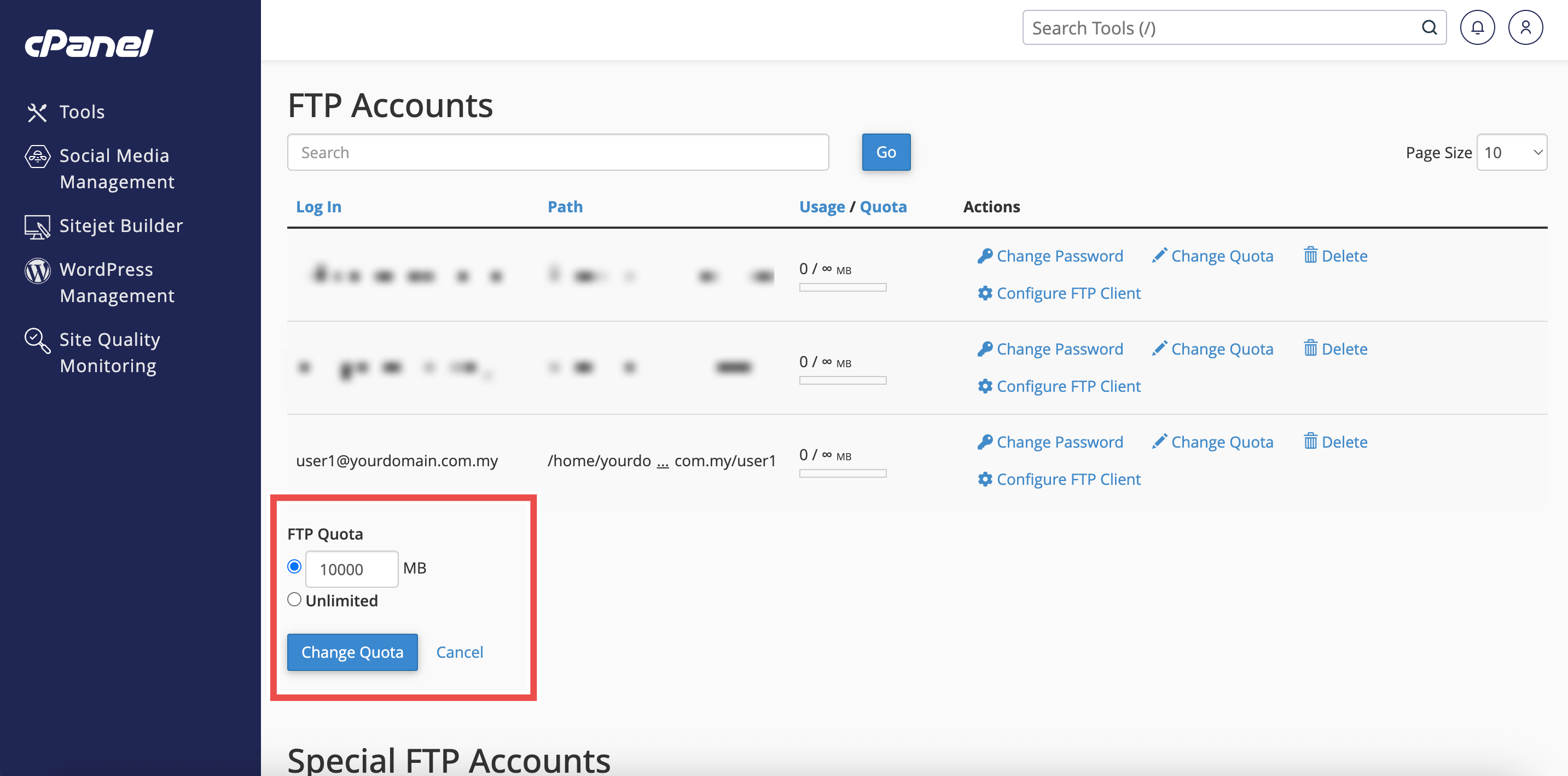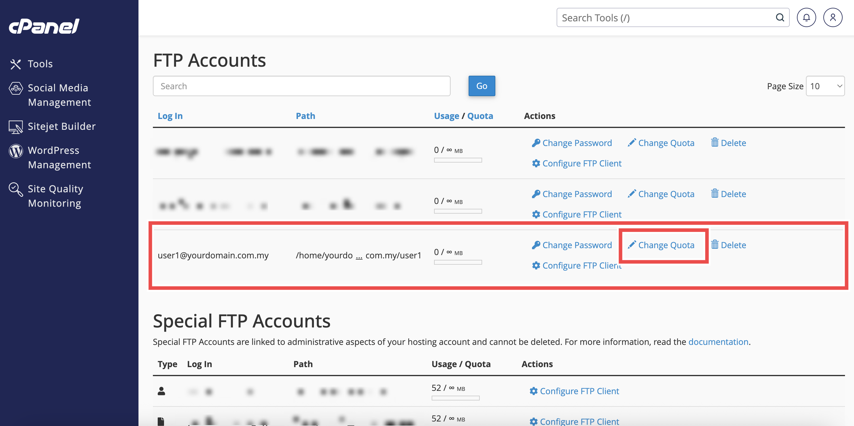 - In the FTP Accounts table, find the account whose quota you want to change.