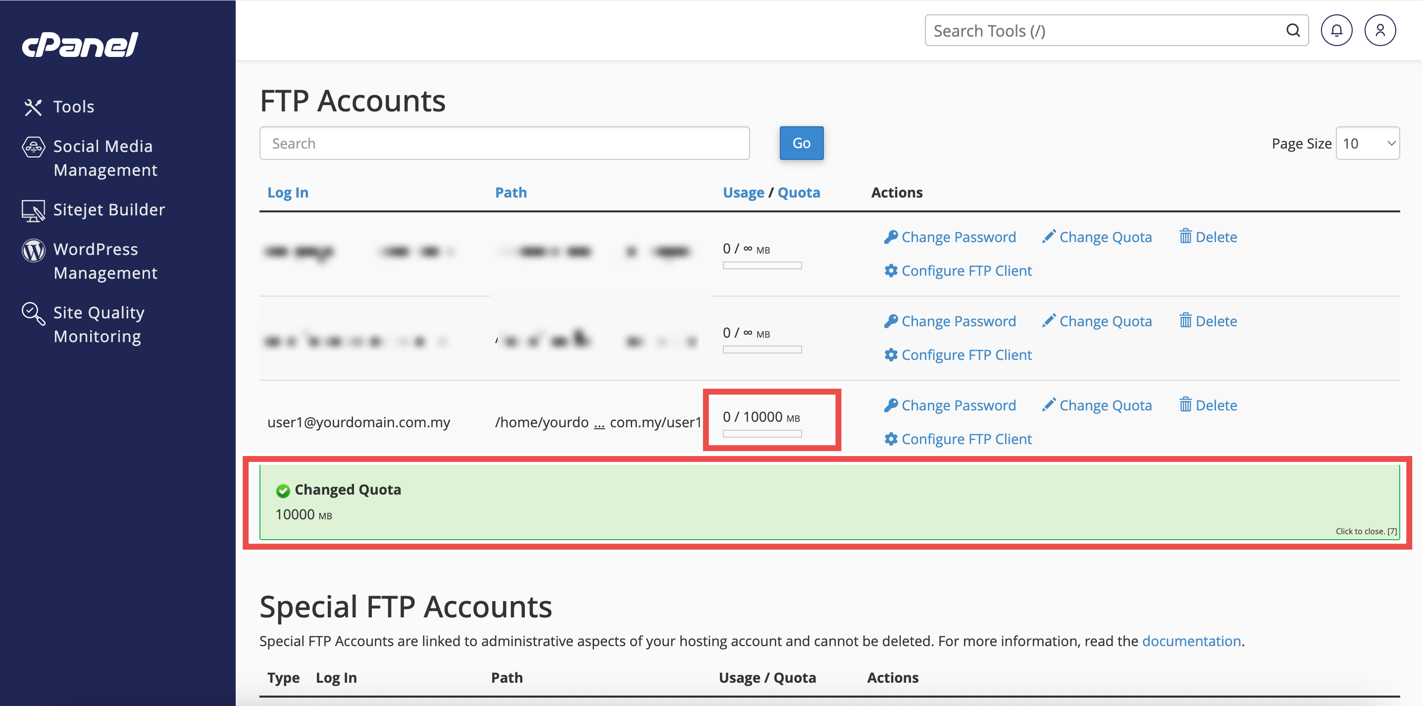 By following these steps, you can easily change the quota for an FTP account in cPanel. This helps you manage disk usage effectively across multiple users.