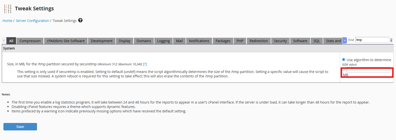 Locate the setting: “Size, in MB, for the /tmp partition secured by securetmp”