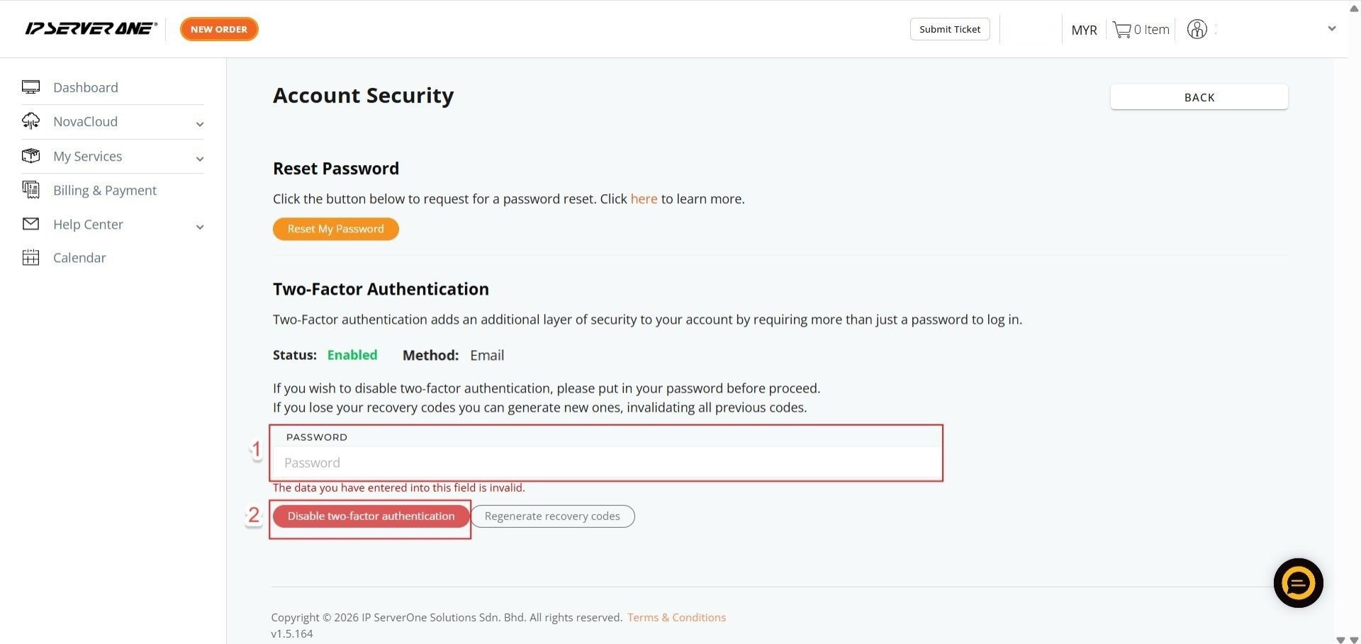 - Click the “Disable 2FA” button to remove the secondary authentication requirement.