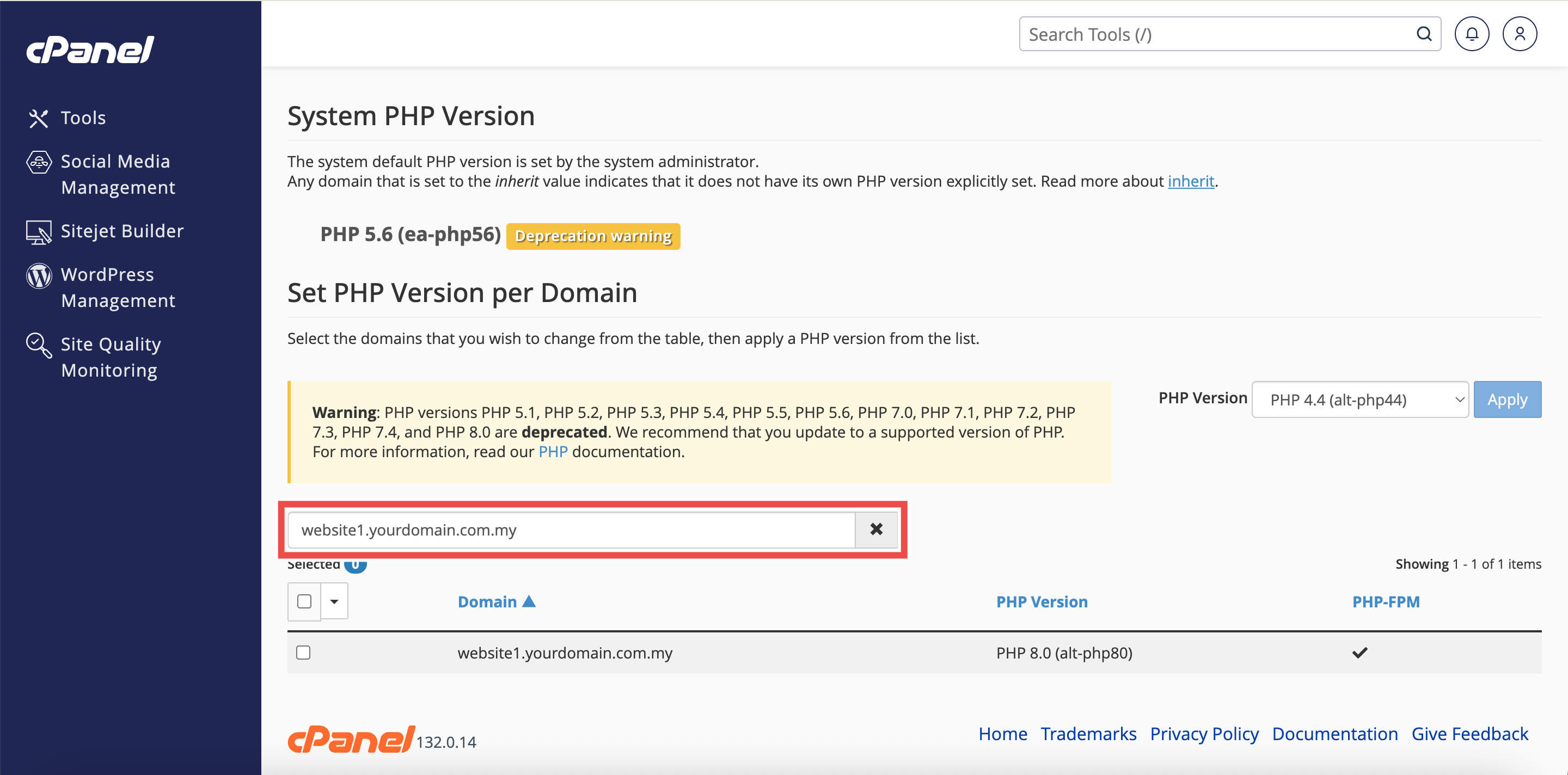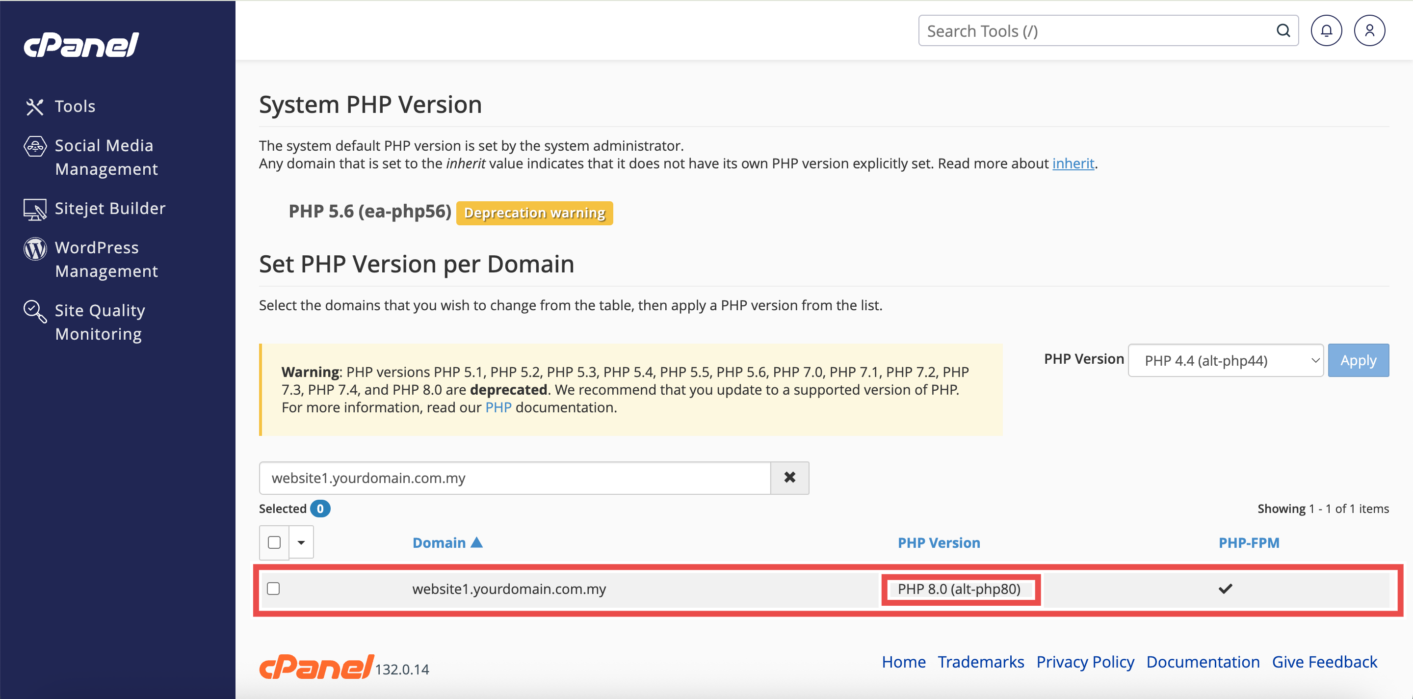 By following these steps, you can successfully check the PHP version of a website using MultiPHP Manager in cPanel. Regularly monitoring your PHP version ensures your website remains compatible with your applications and maintains optimal security and performance. If you need to change your PHP version or enable PHP-FPM, you can do so directly from the MultiPHP Manager interface.