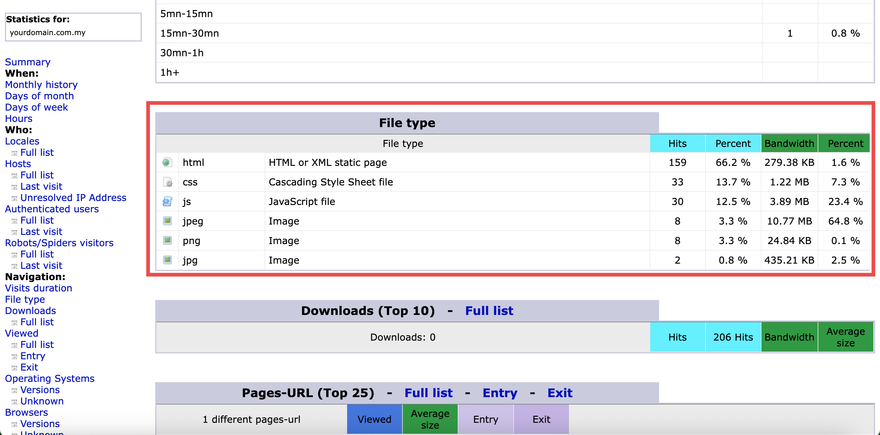 - Hits: The number of times files of this type were requested by visitors.