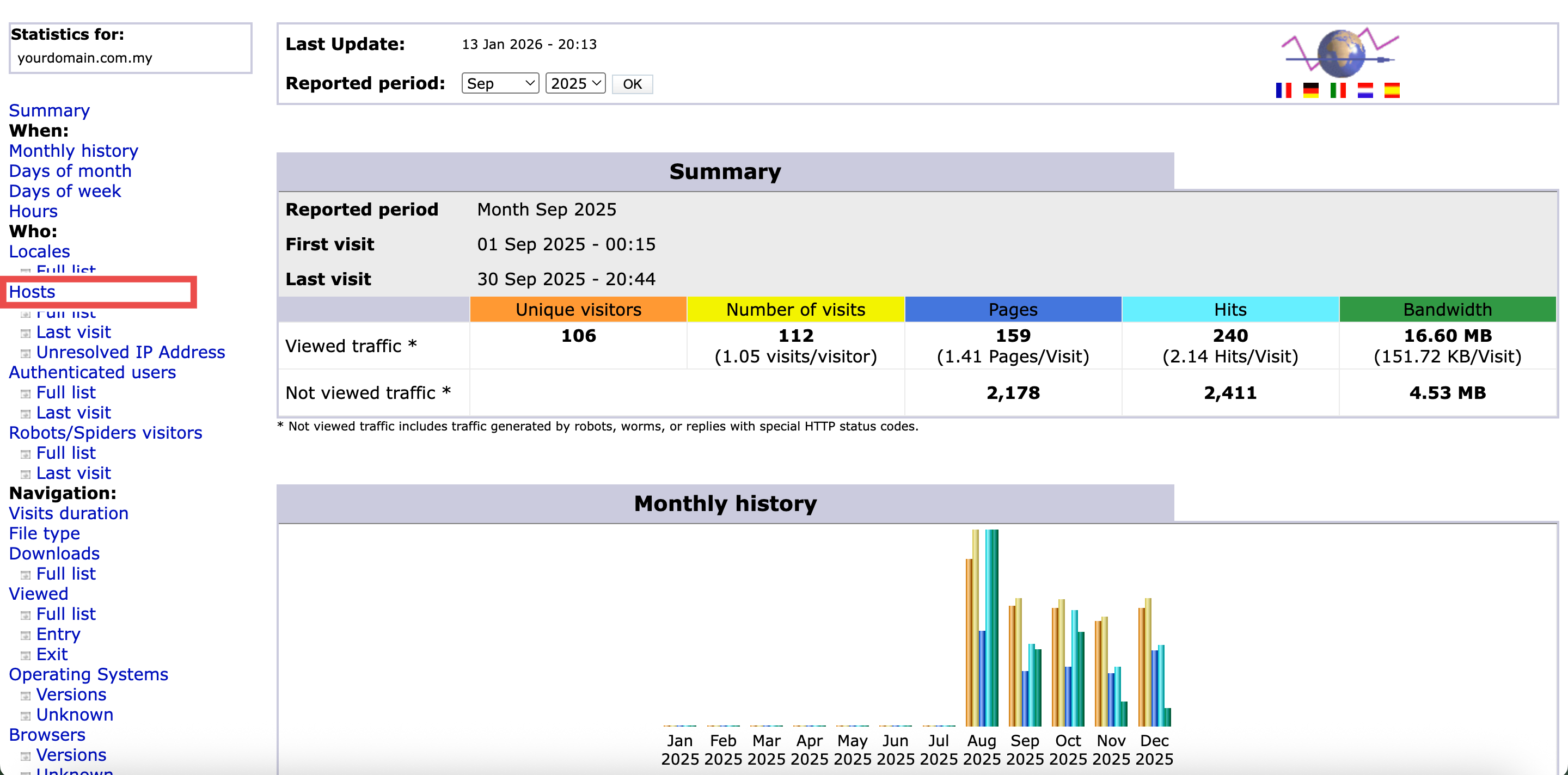 - You will be directed to the Hosts section of the page which consist of full list, last visit and Unresolved IP Address.