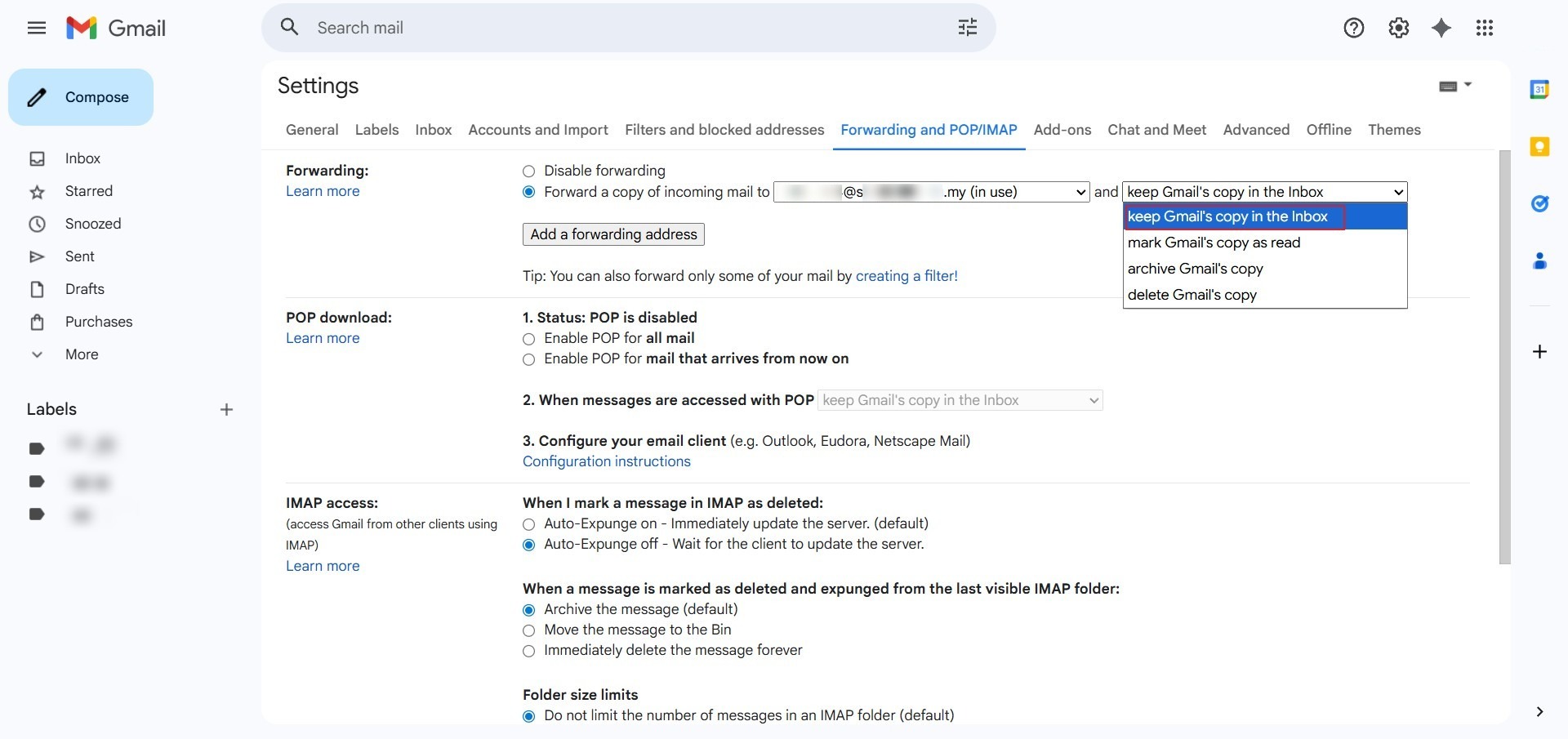 - In the secondary dropdown menu, select the option: “keep Gmail’s copy in the inbox”.