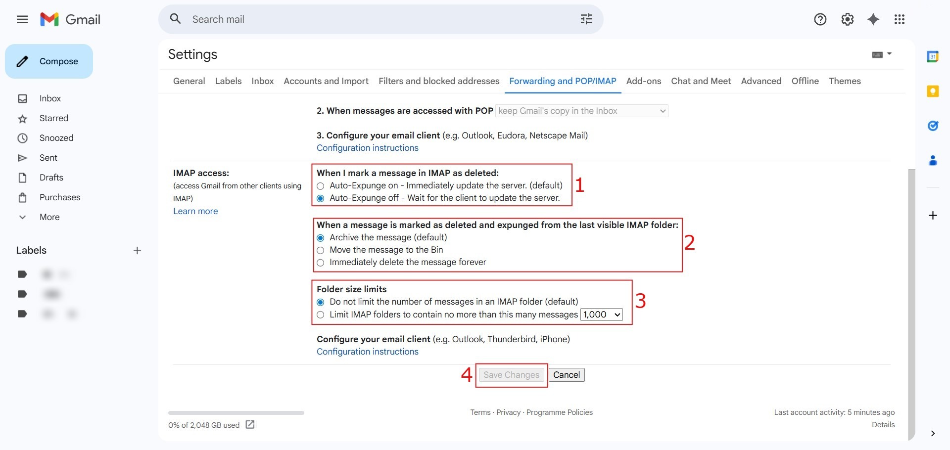 - Finalizing Your Setup: Your new synchronization rules, including deletion behavior and expunge preferences, will only take effect after you click “Save Changes” at the bottom of the settings page.