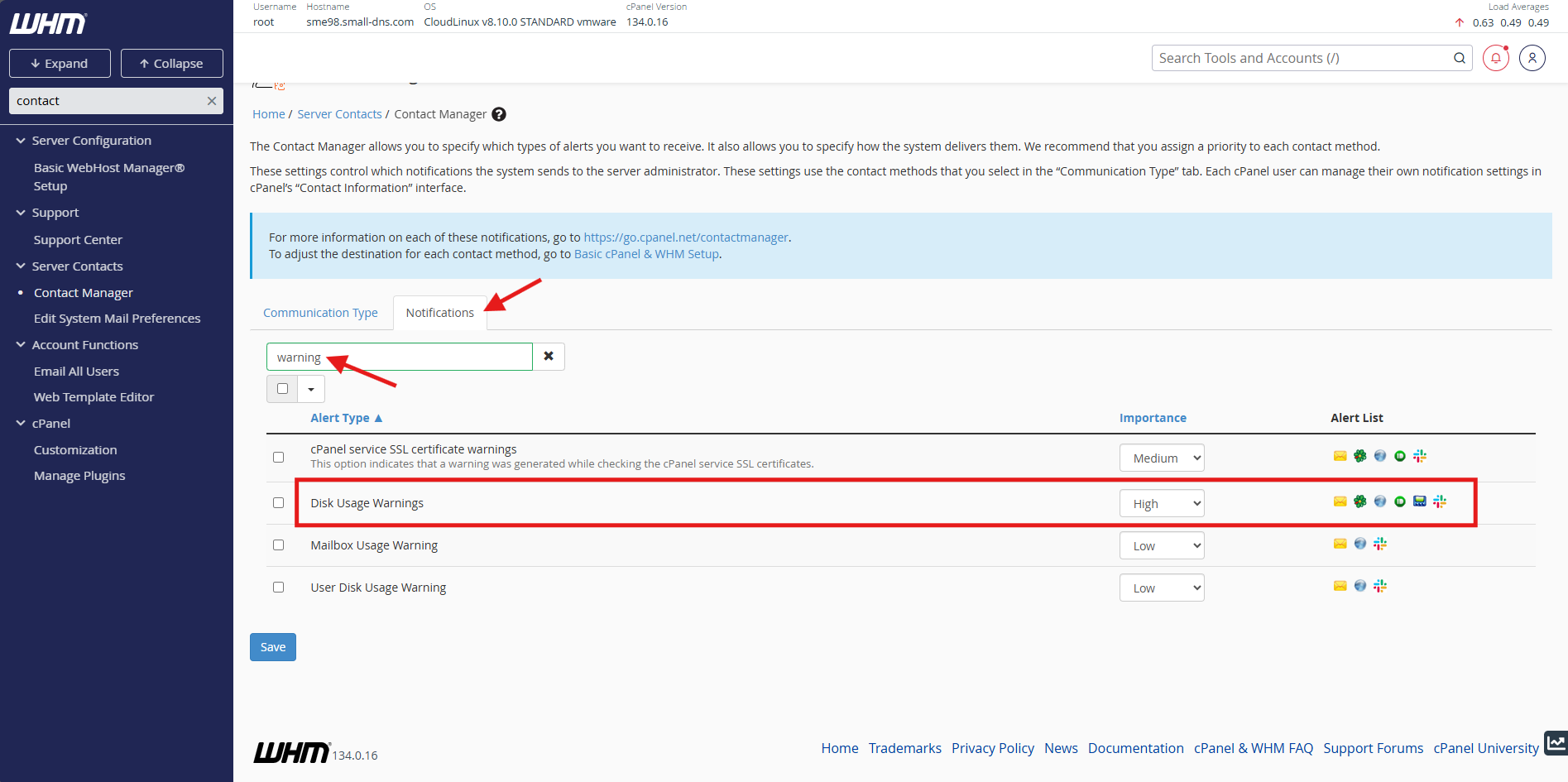 How to configure server disk usage alerts in cPanel