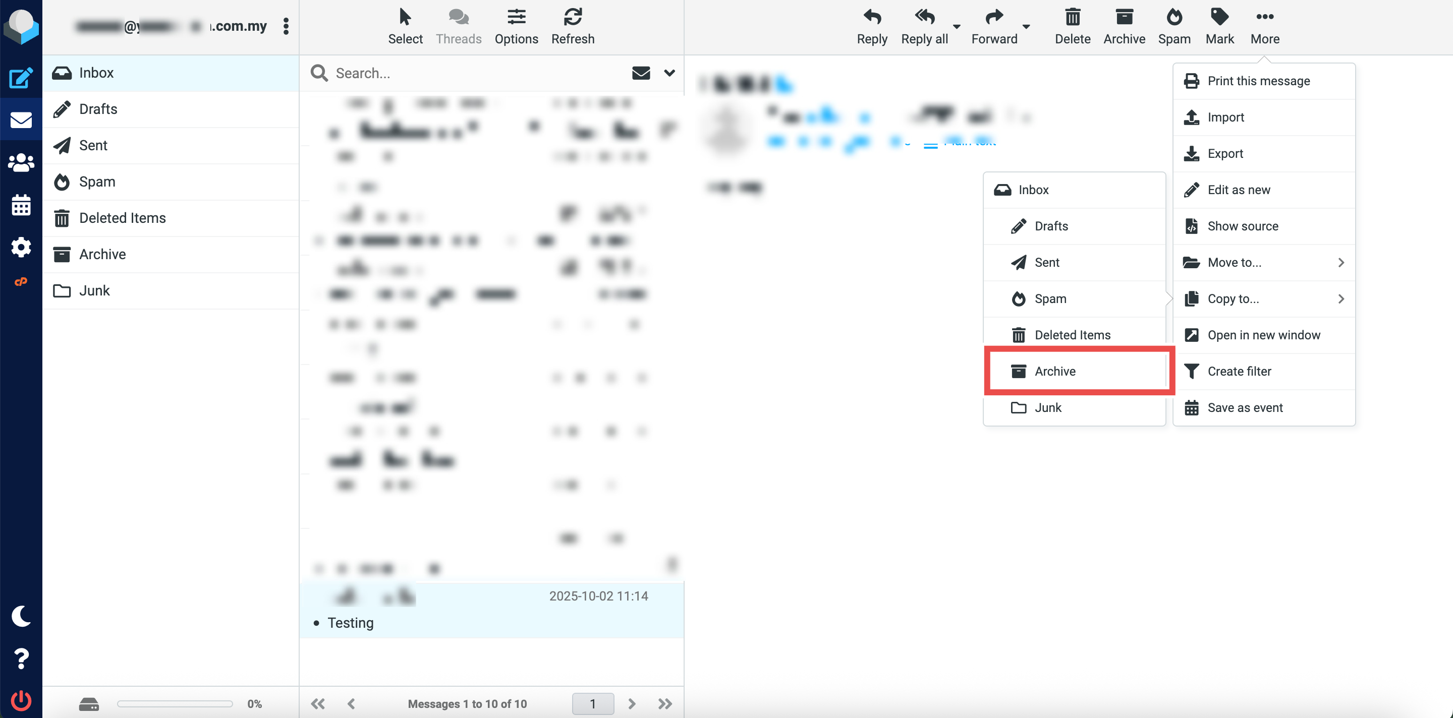 - Click Archive to copy the selected email(s) to the Archive folder.