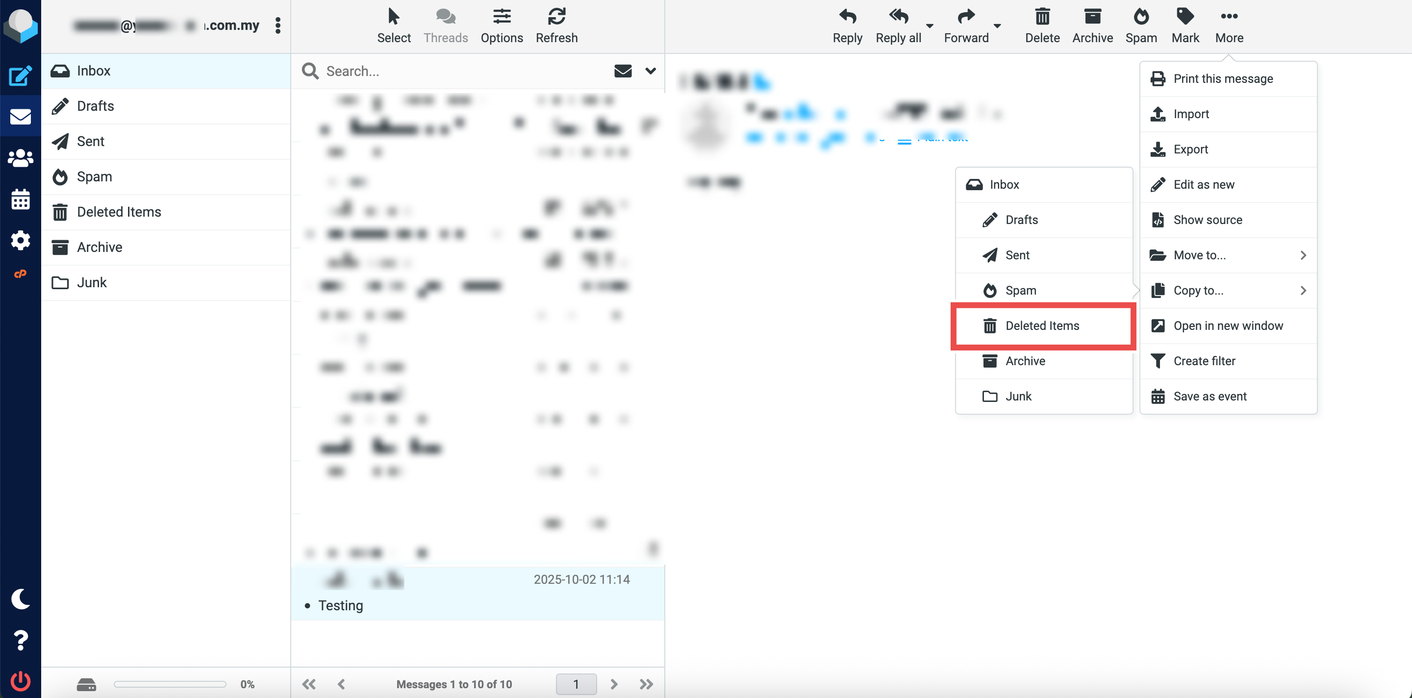 • Click Deleted Items  to copy the selected email(s) to the Deleted Items folder.