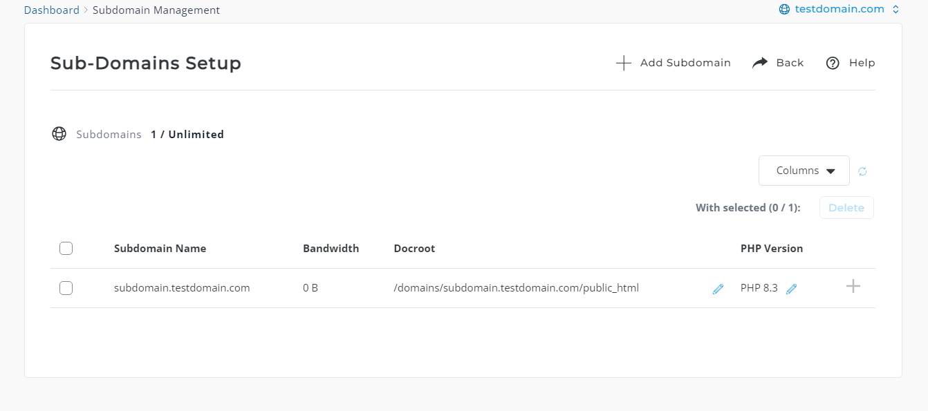 - Click on Subdomain Management.