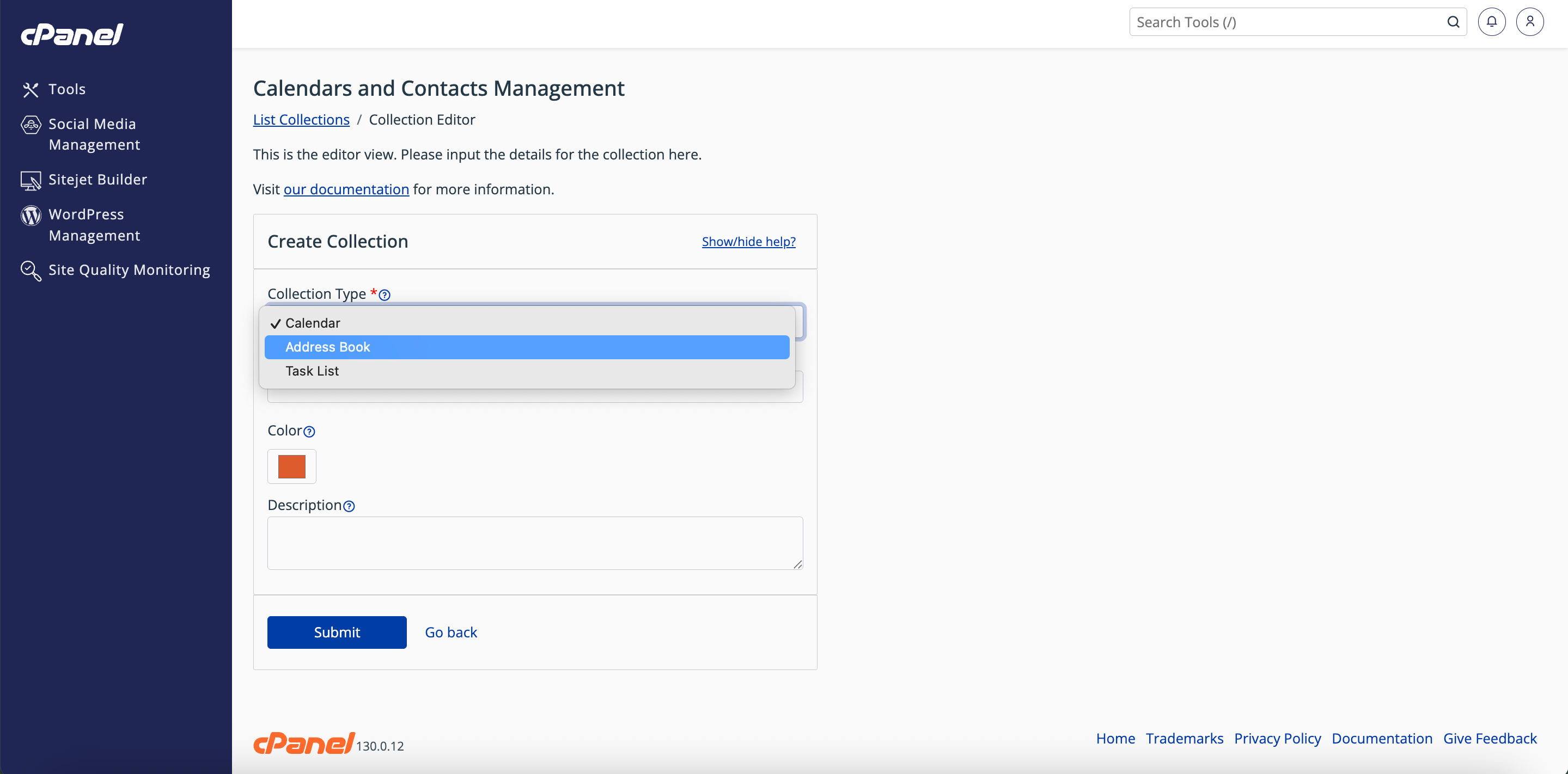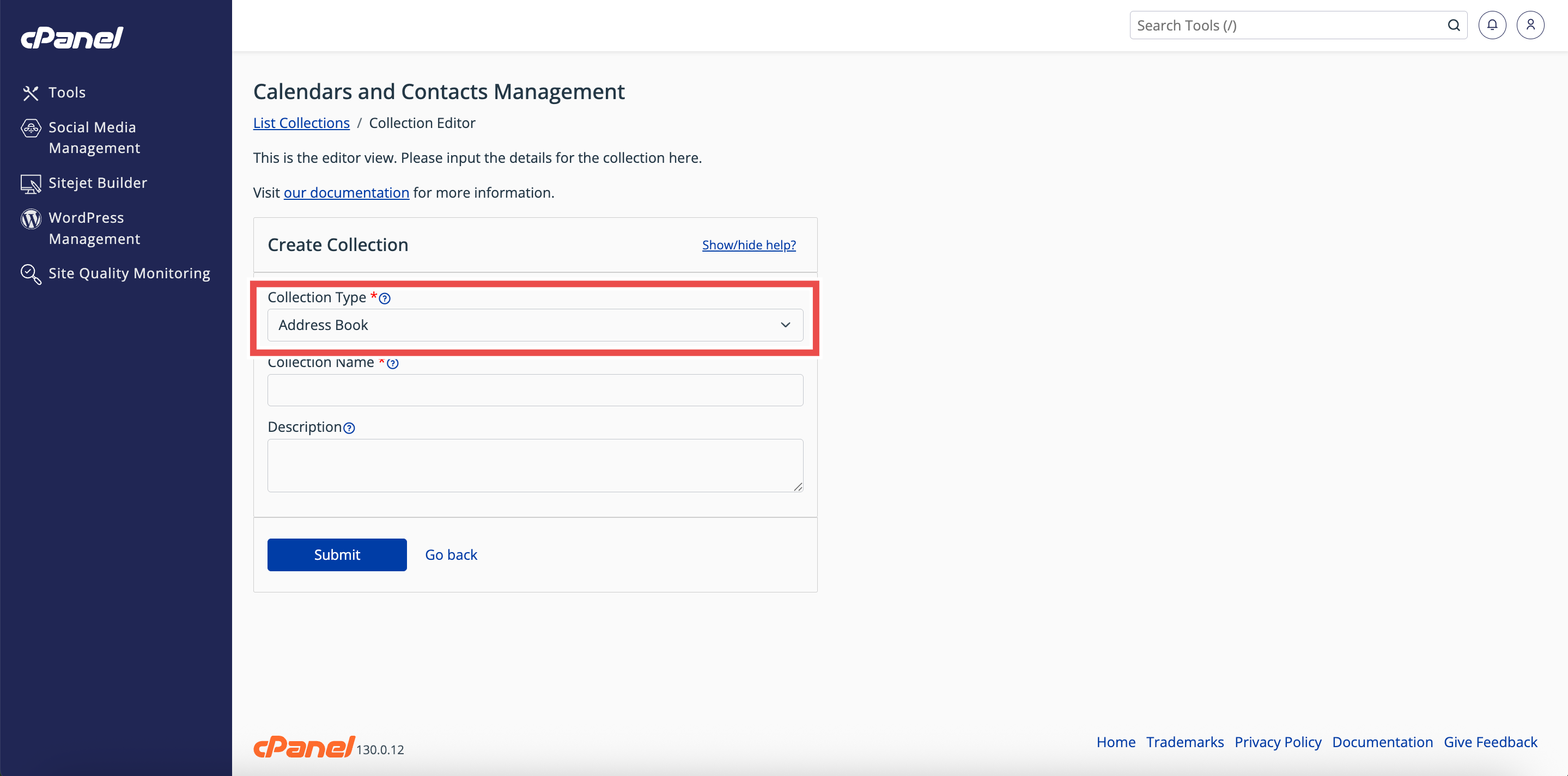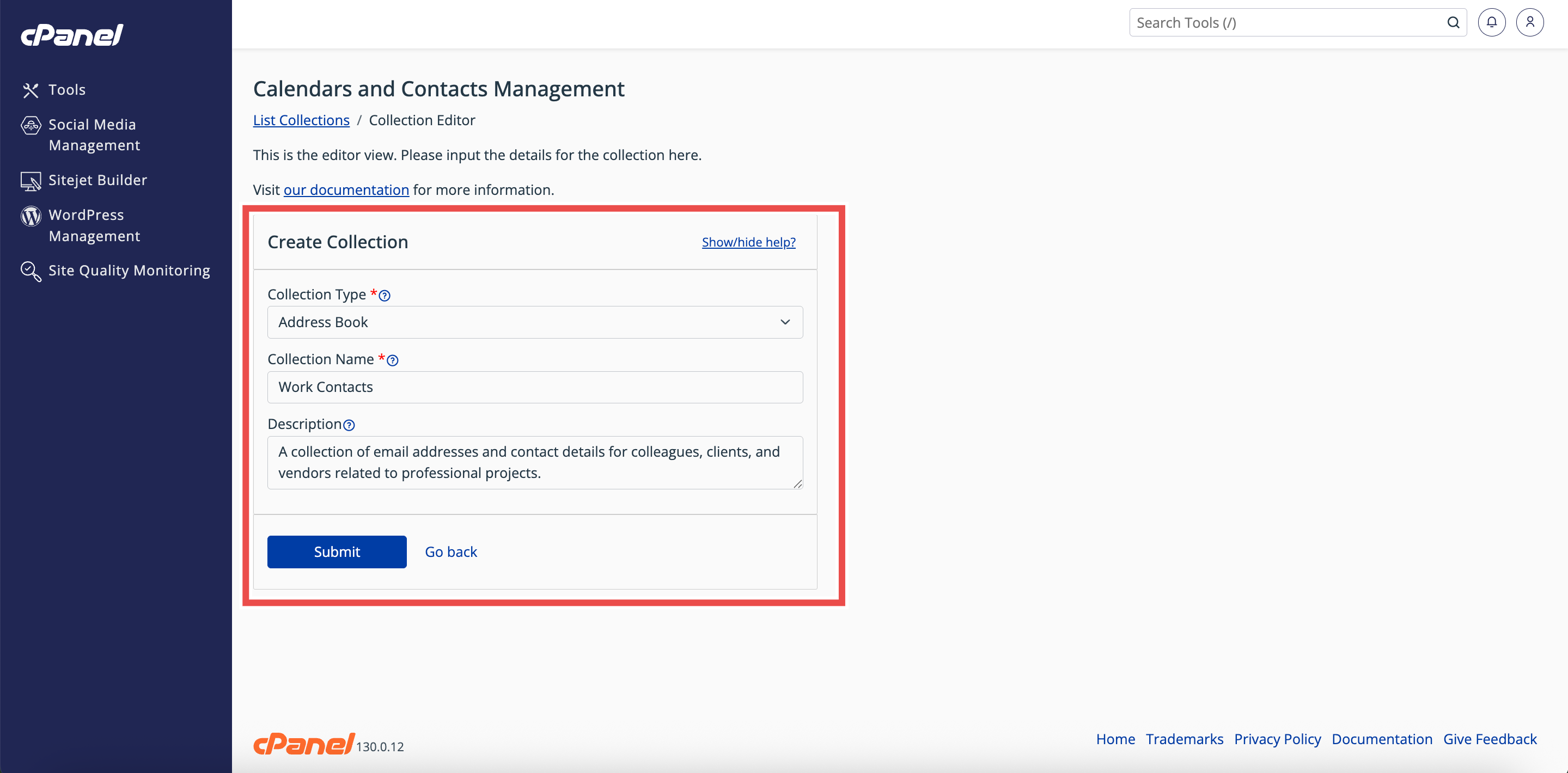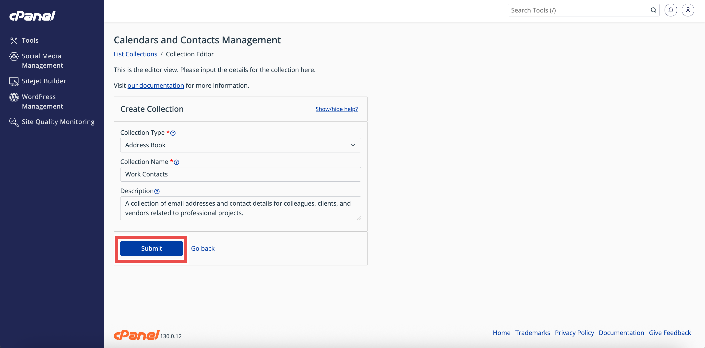 By following these steps, you can easily create a new address book in cPanel to organize and manage your contacts. Always verify that the address book appears in the table to confirm successful creation.