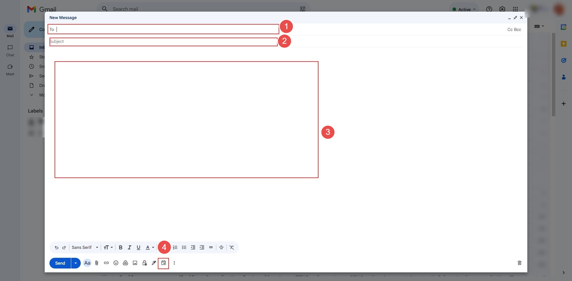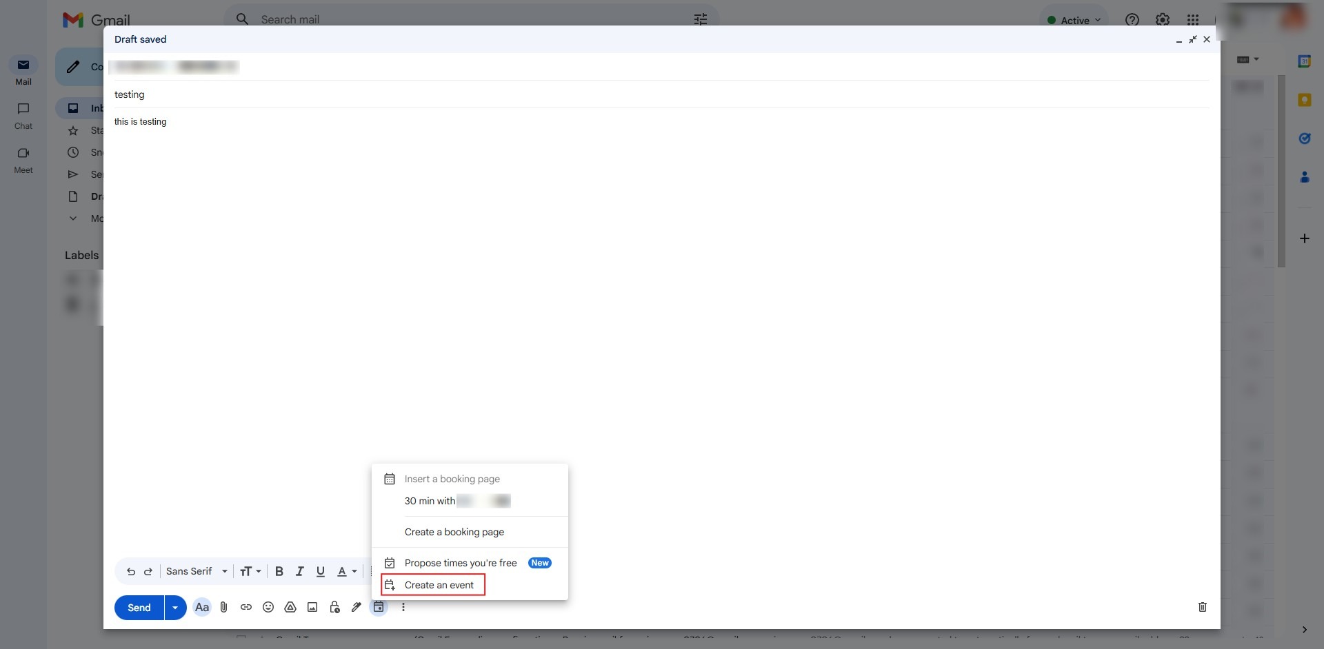 - Key in the recipient’s email, subject, and message; then, select the calendar icon at the bottom of the window to bridge the email with your schedule.