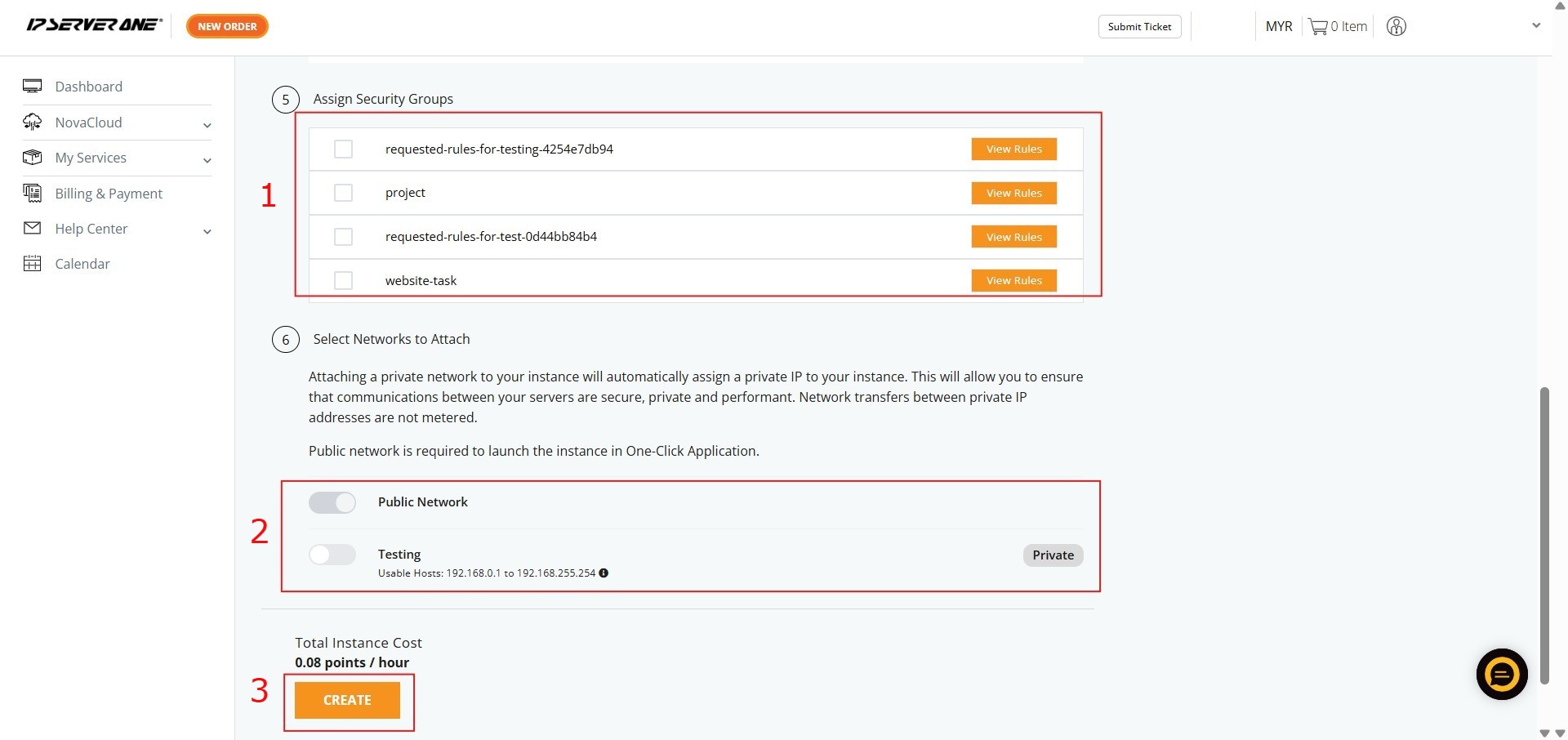 Step 12: Assign Security Groups, Select Network to attach and click create