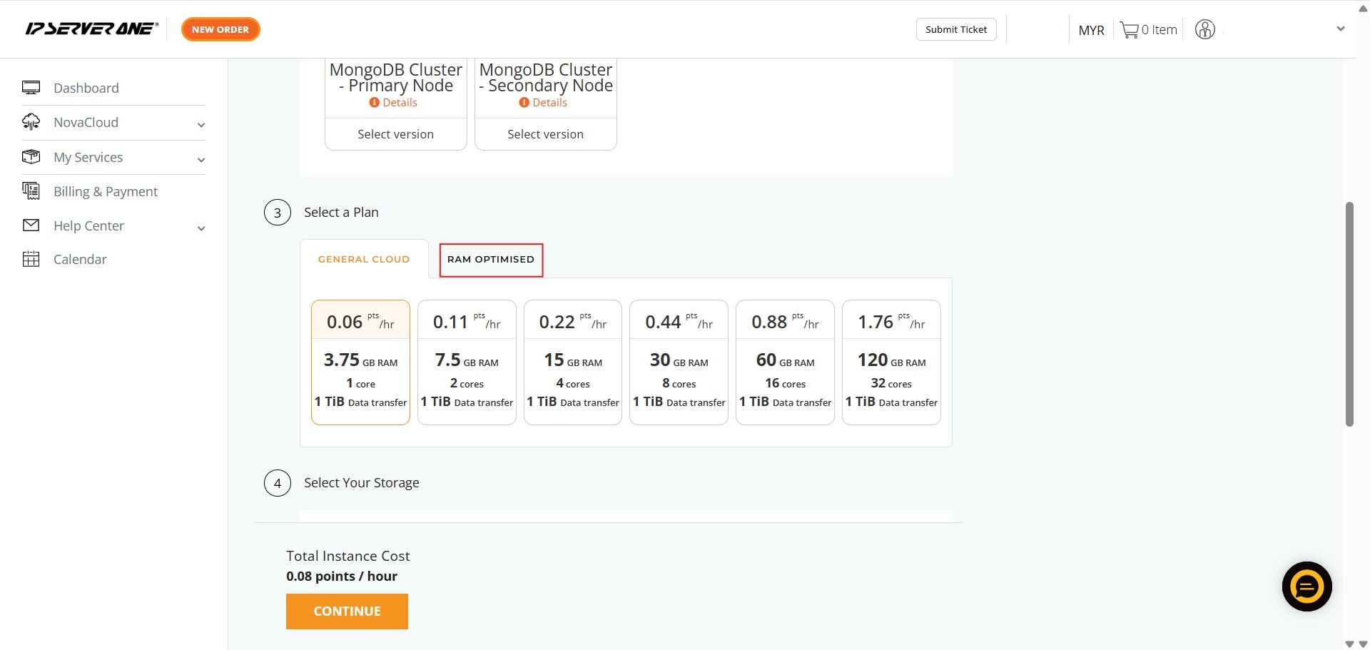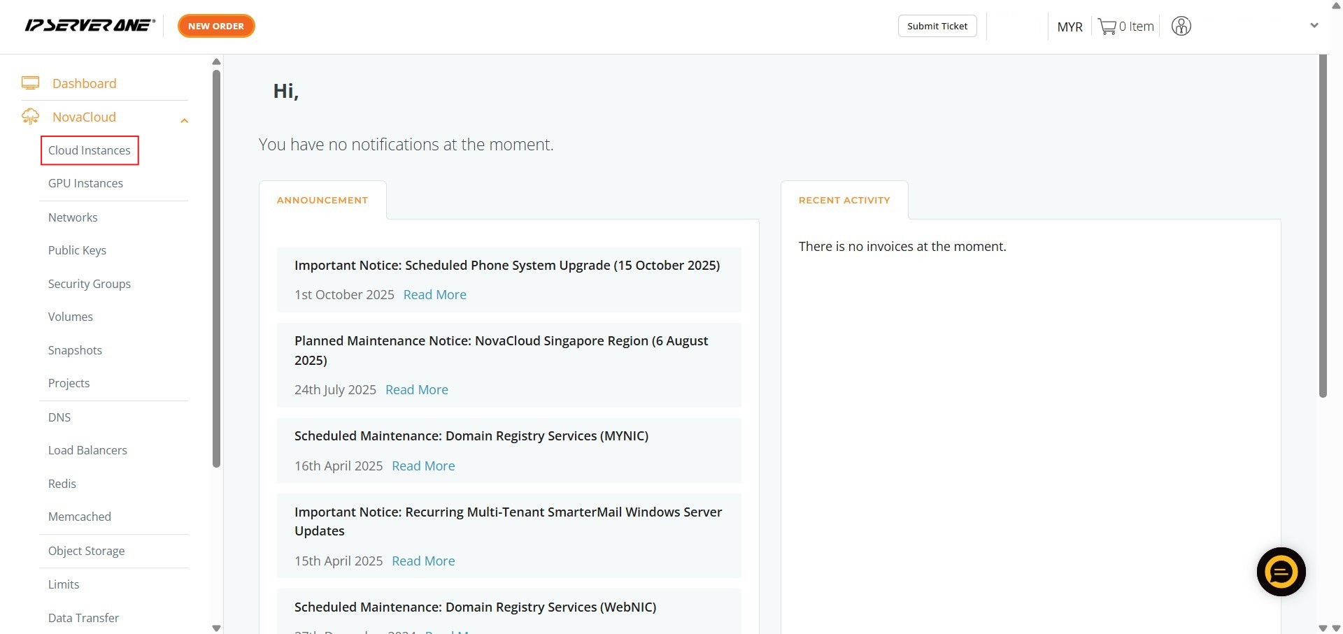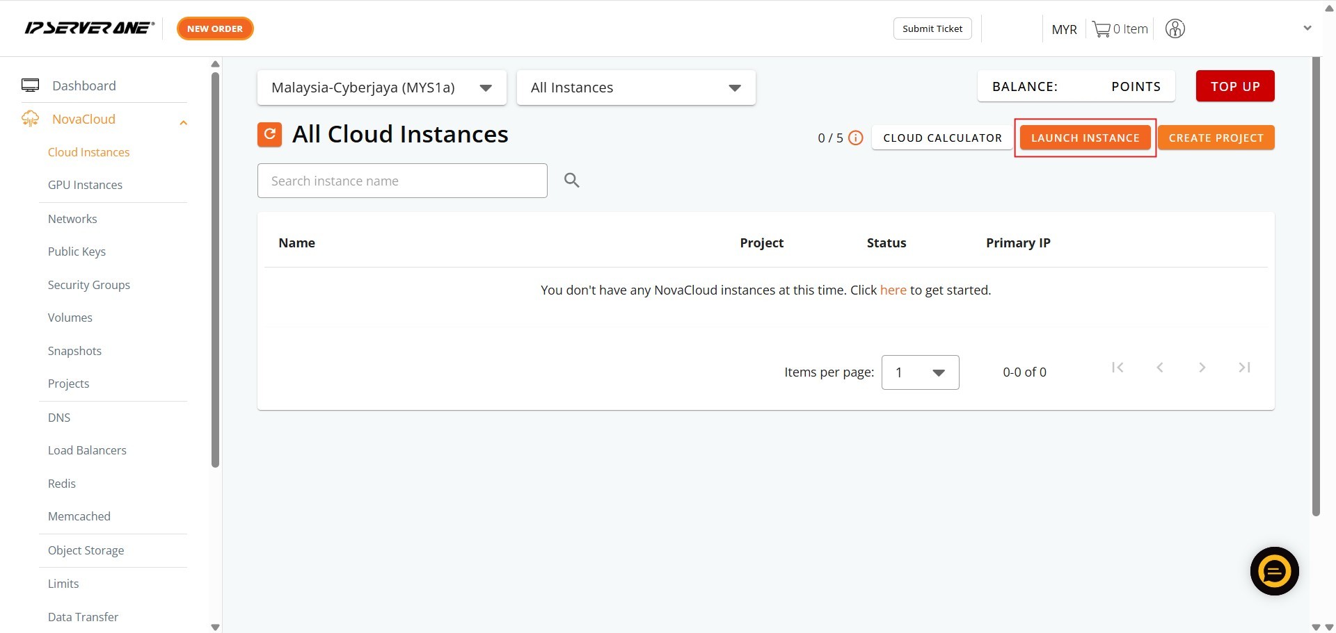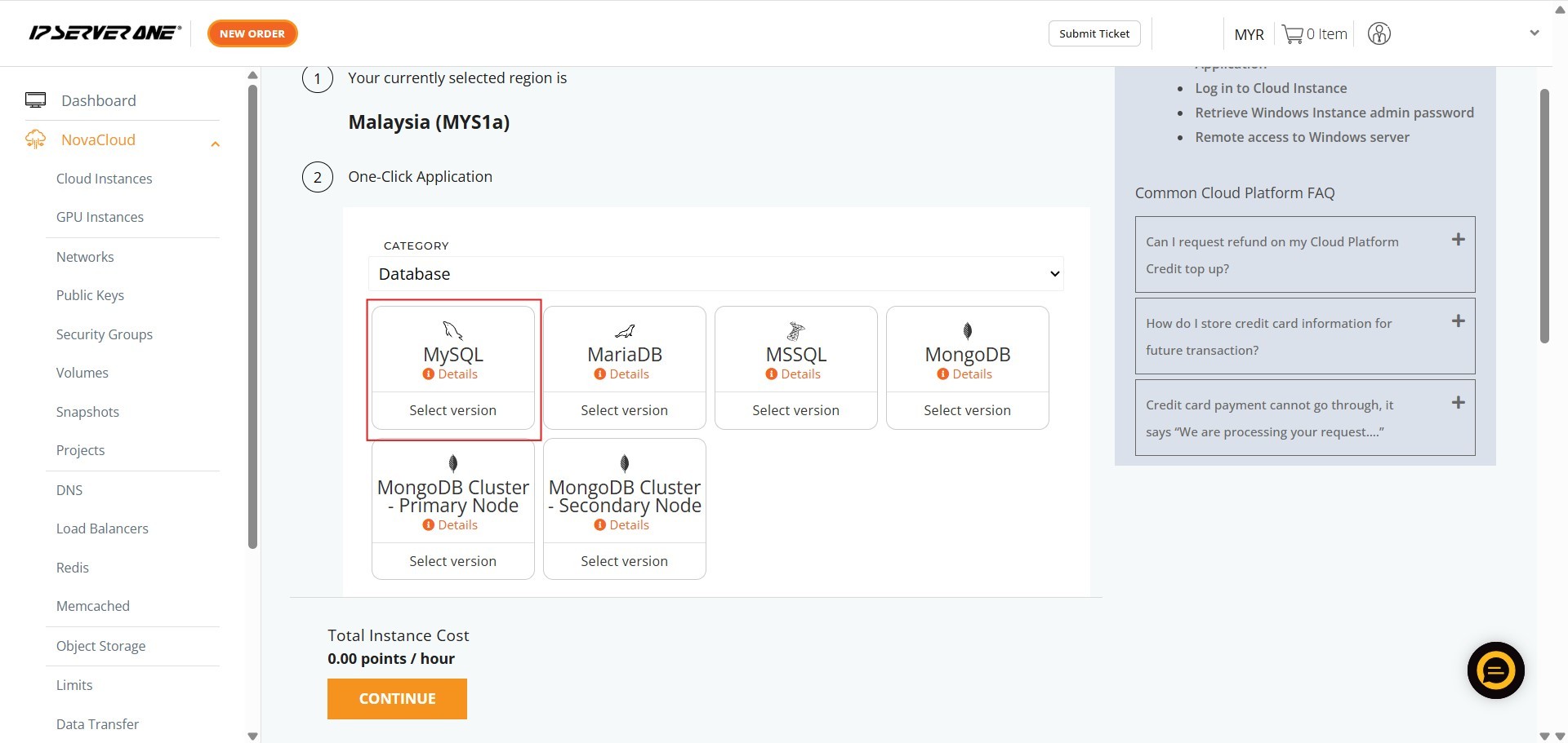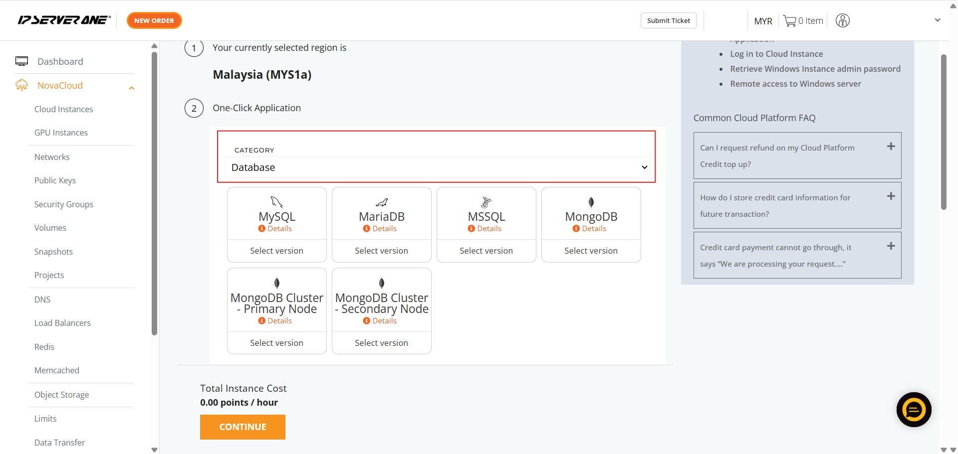 This guide provides a professional, step-by-step walkthrough detailing how to launch a Cloud Instance containing your desired database using the One-Click Application feature in the NovaCloud Customer Portal. This process enables users to quickly provision a ready-to-use database environment when launching a cloud instance.