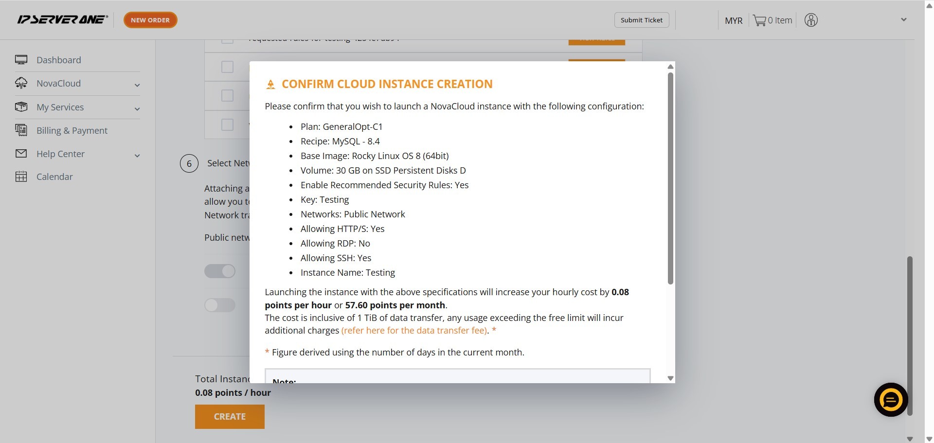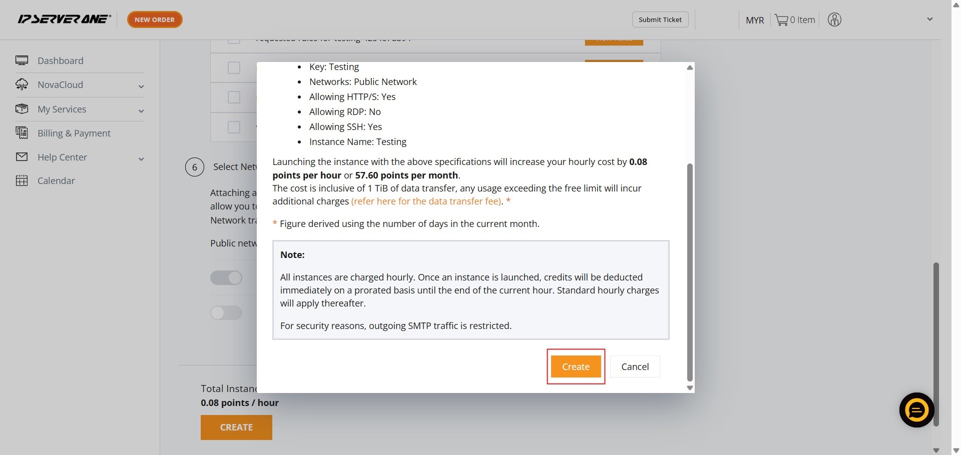 - A confirmation pop-up will appear. Review the specifications, scroll to the bottom, and click Create to launch the instance.