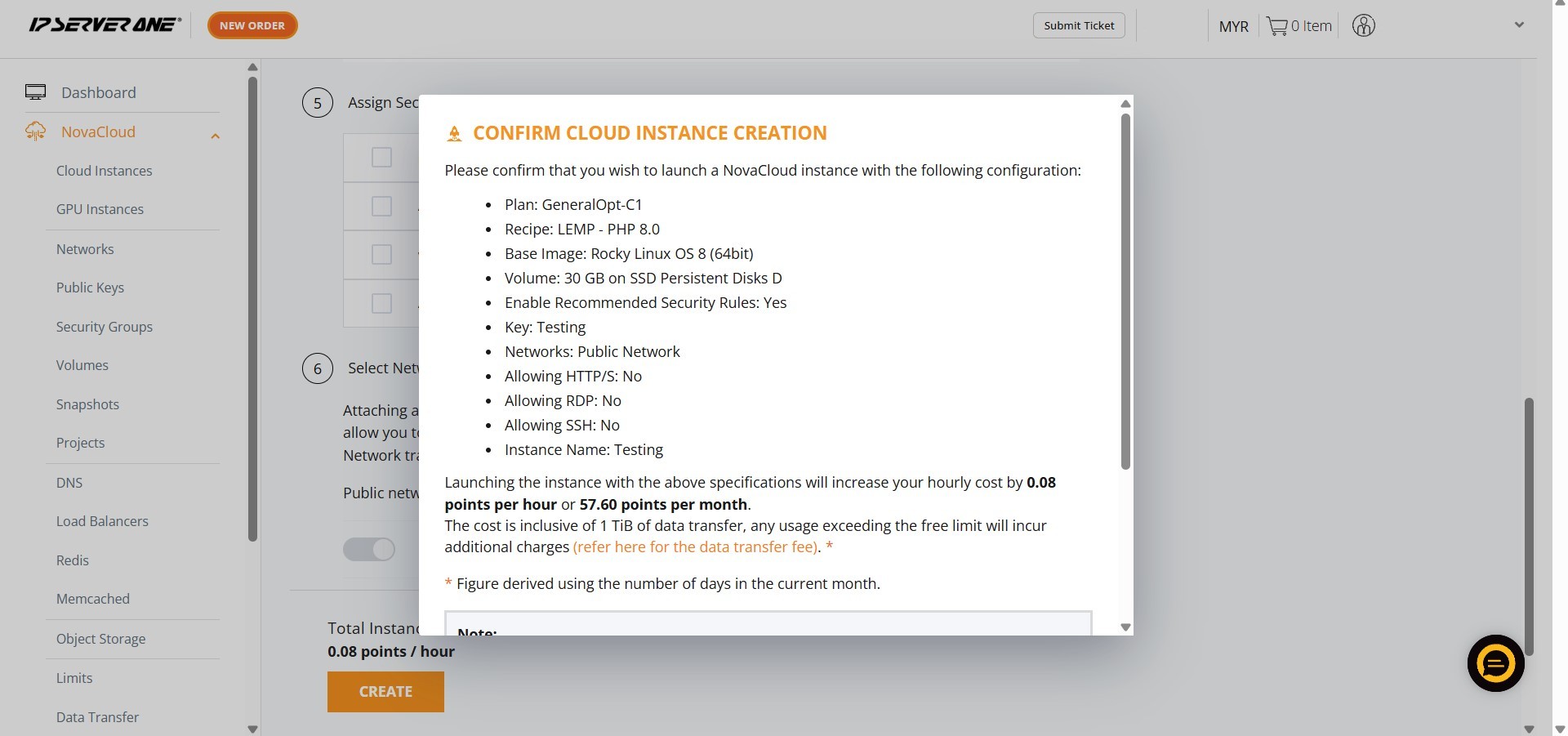 - A confirmation pop-up will appear. Review the specifications, scroll to the bottom, and click Create to launch the instance.