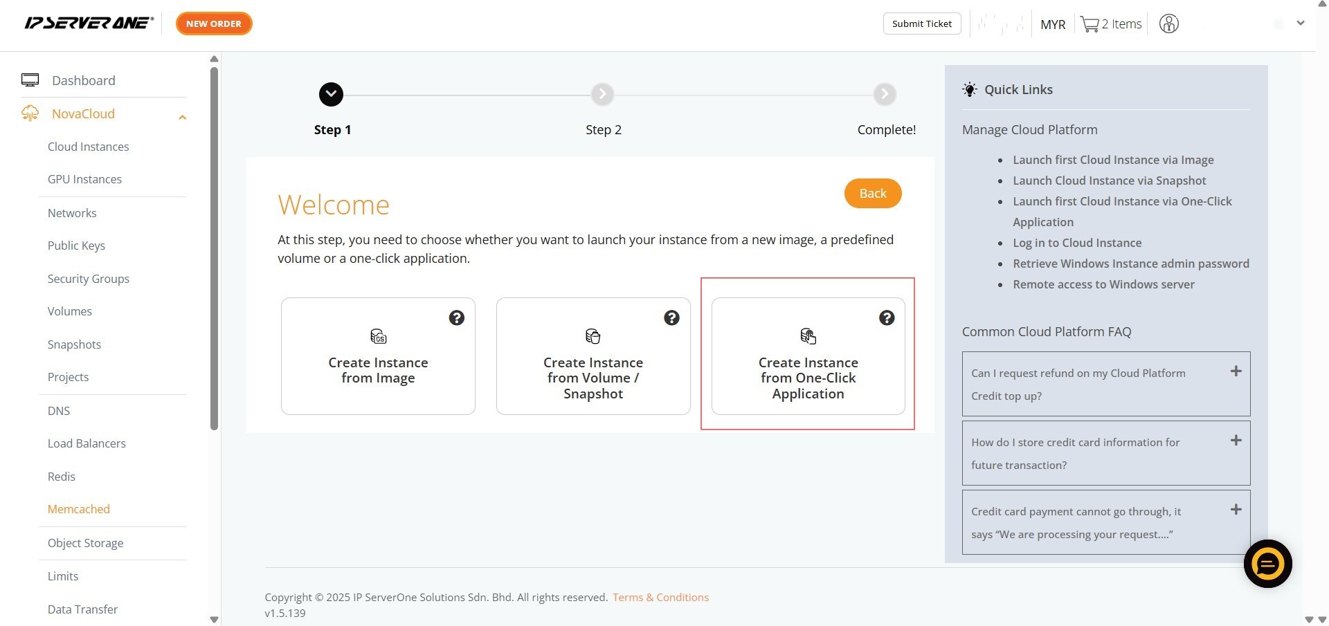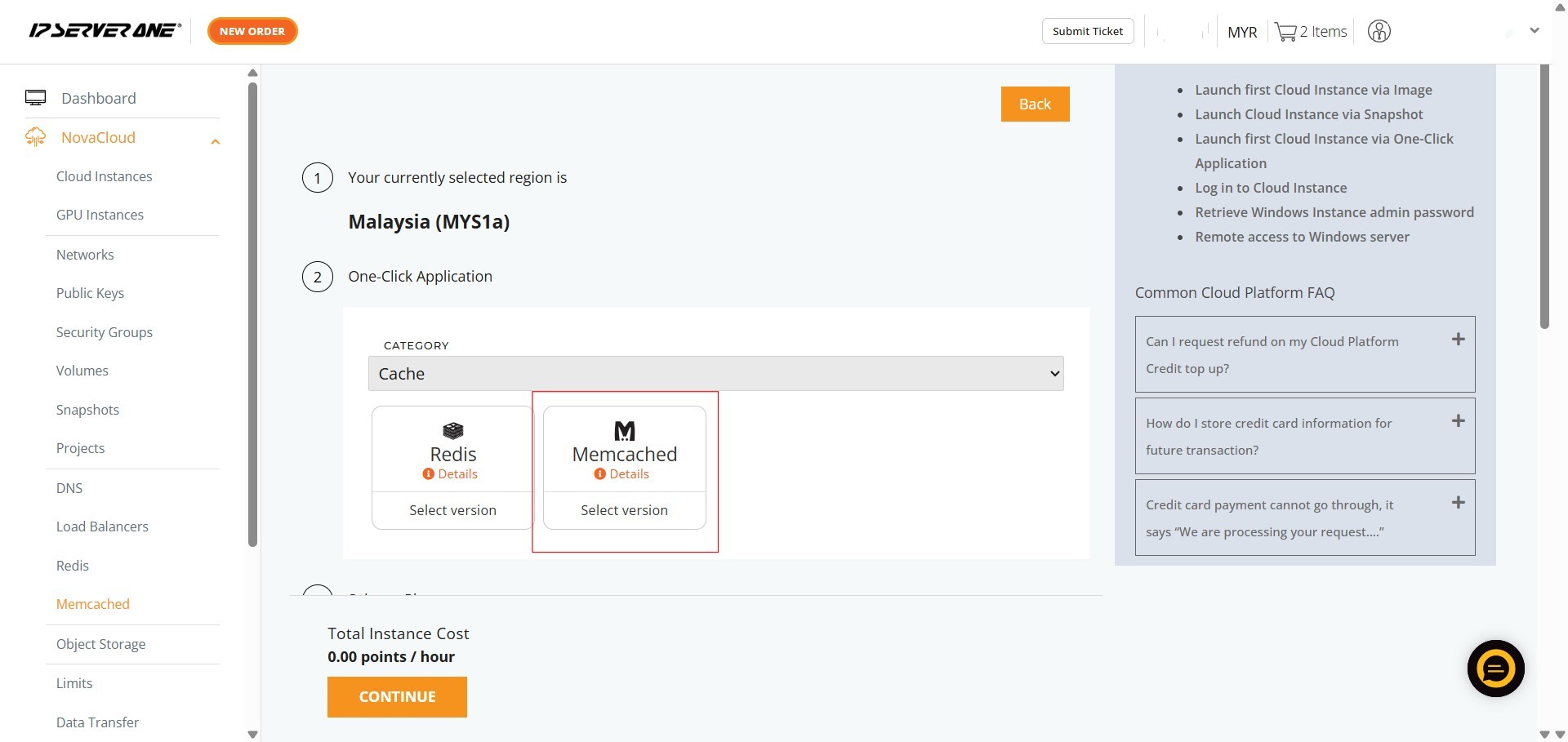 How to Create Memcached with Create Instance from One-Click Application in Customer Portal