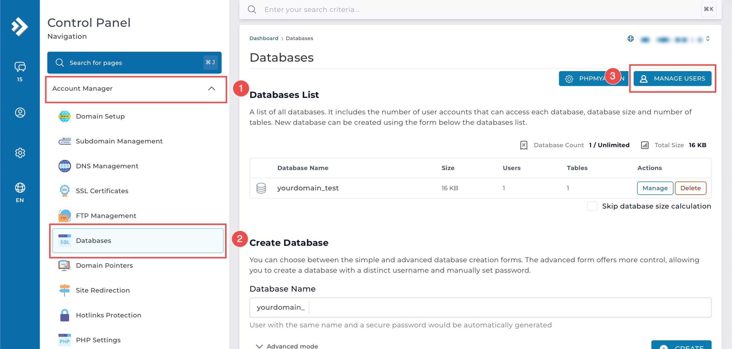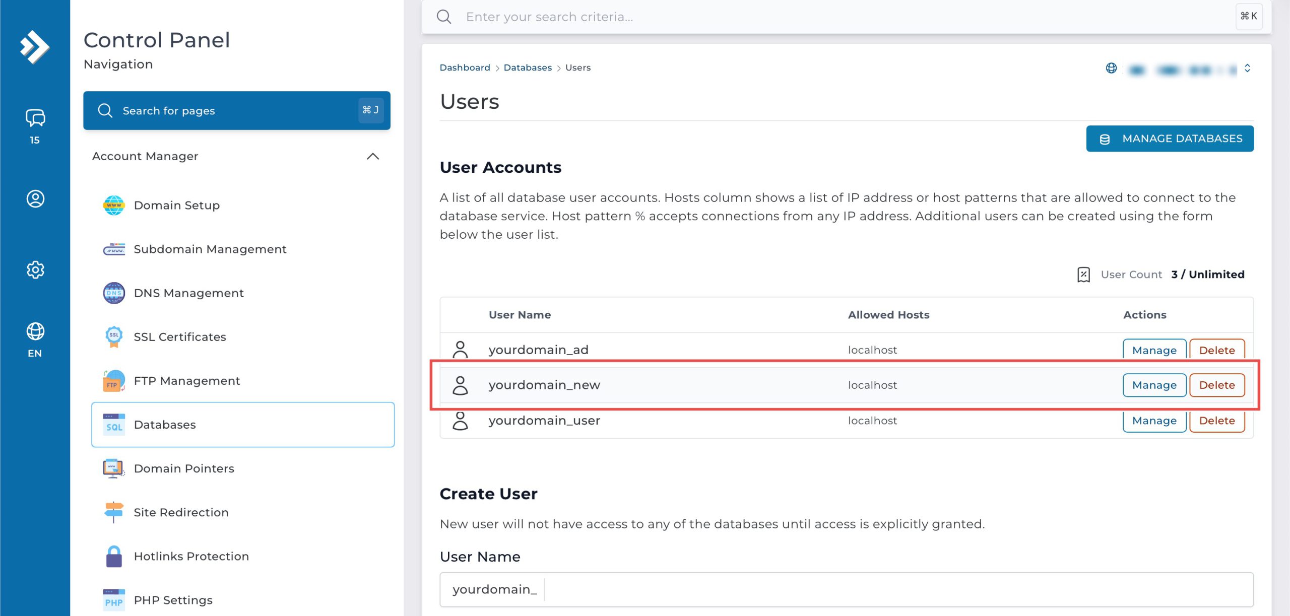 Database users provide authenticated access to your databases, and creating separate user accounts is essential for managing permissions and maintaining security. Setting up dedicated database users for different applications, development environments, or team members enables granular access control and follows security best practices. DirectAdmin’s Databases interface provides a straightforward method for creating new database user accounts with custom credentials. This guide explains how to create database users using the Account Manager > Databases section in DirectAdmin, enabling you to manage database access efficiently and securely.