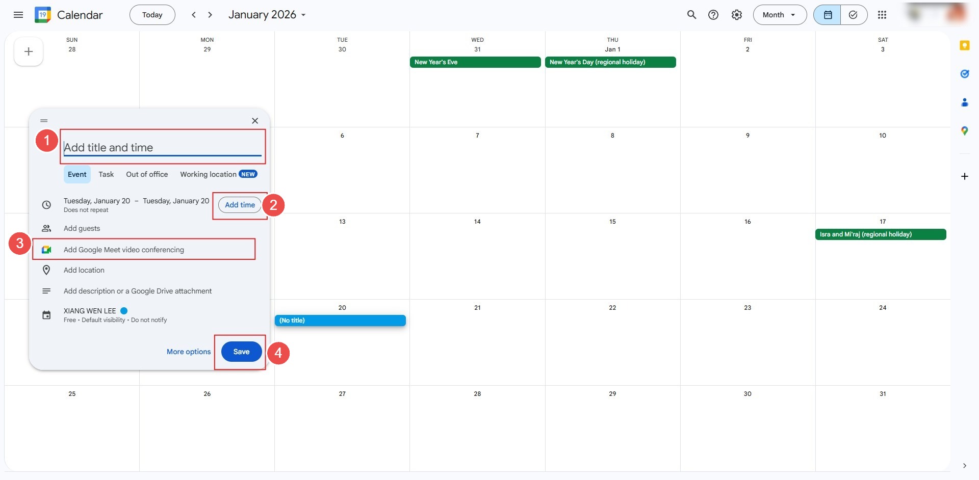 • In the event creation window, key in a descriptive meeting name to ensure clarity for all stakeholders.