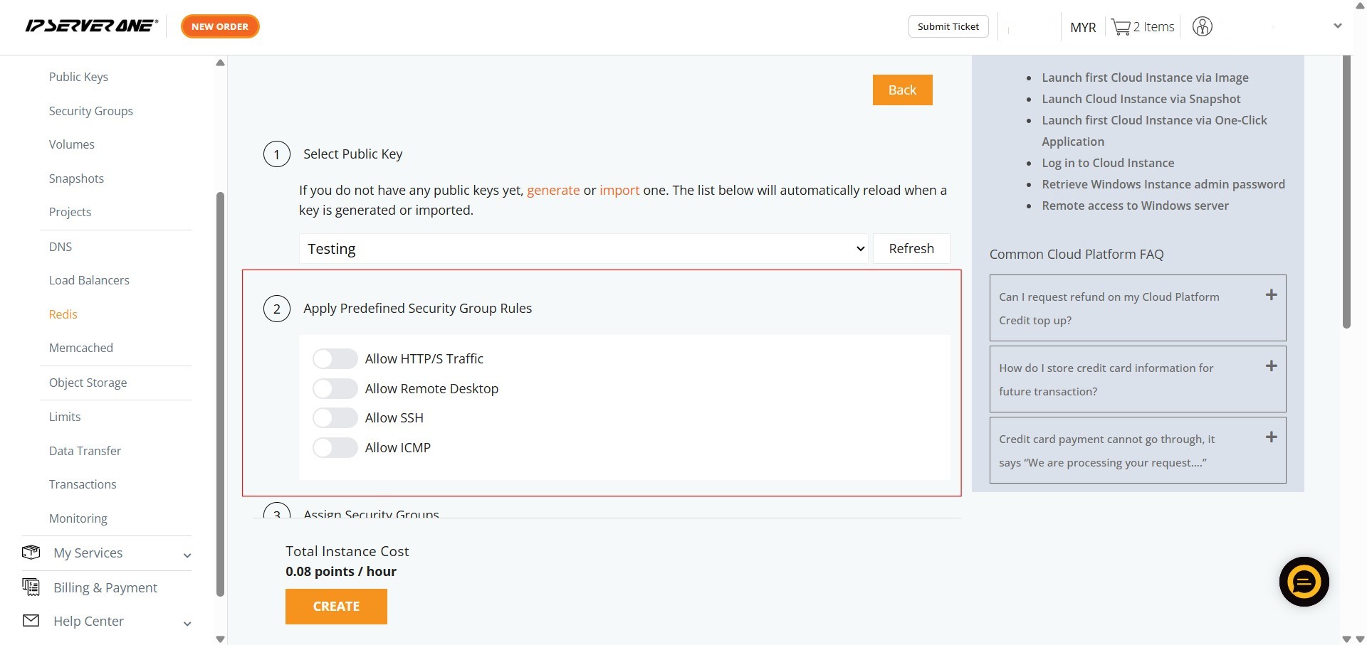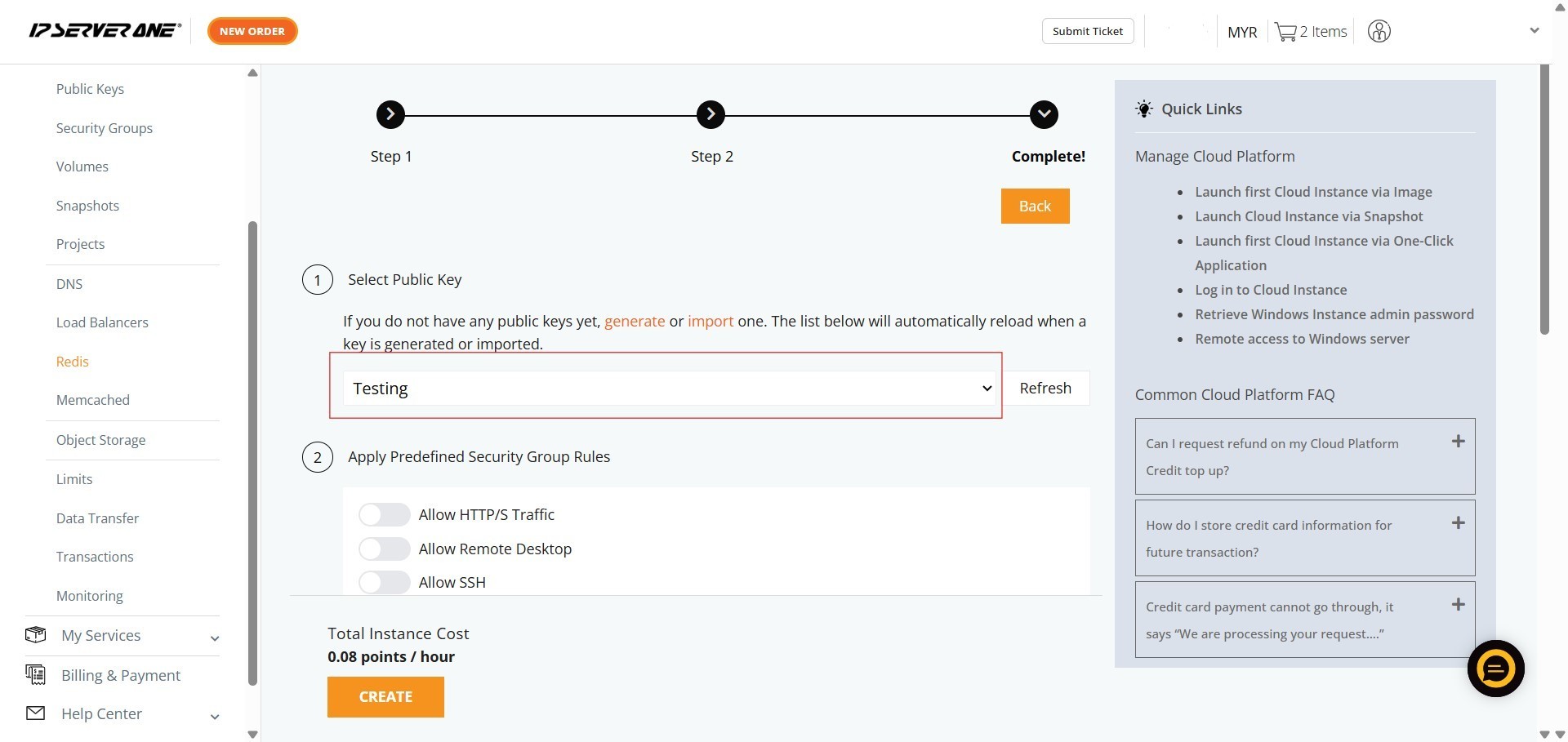 - On the next screen, you need to select a Public Key from the dropdown menu. This key will be used to access your instance.