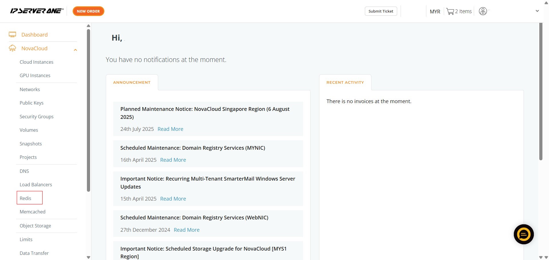 - Within the expanded NovaCloud dropdown menu, find and click on “Redis”. This action will direct you to the Redis management interface.