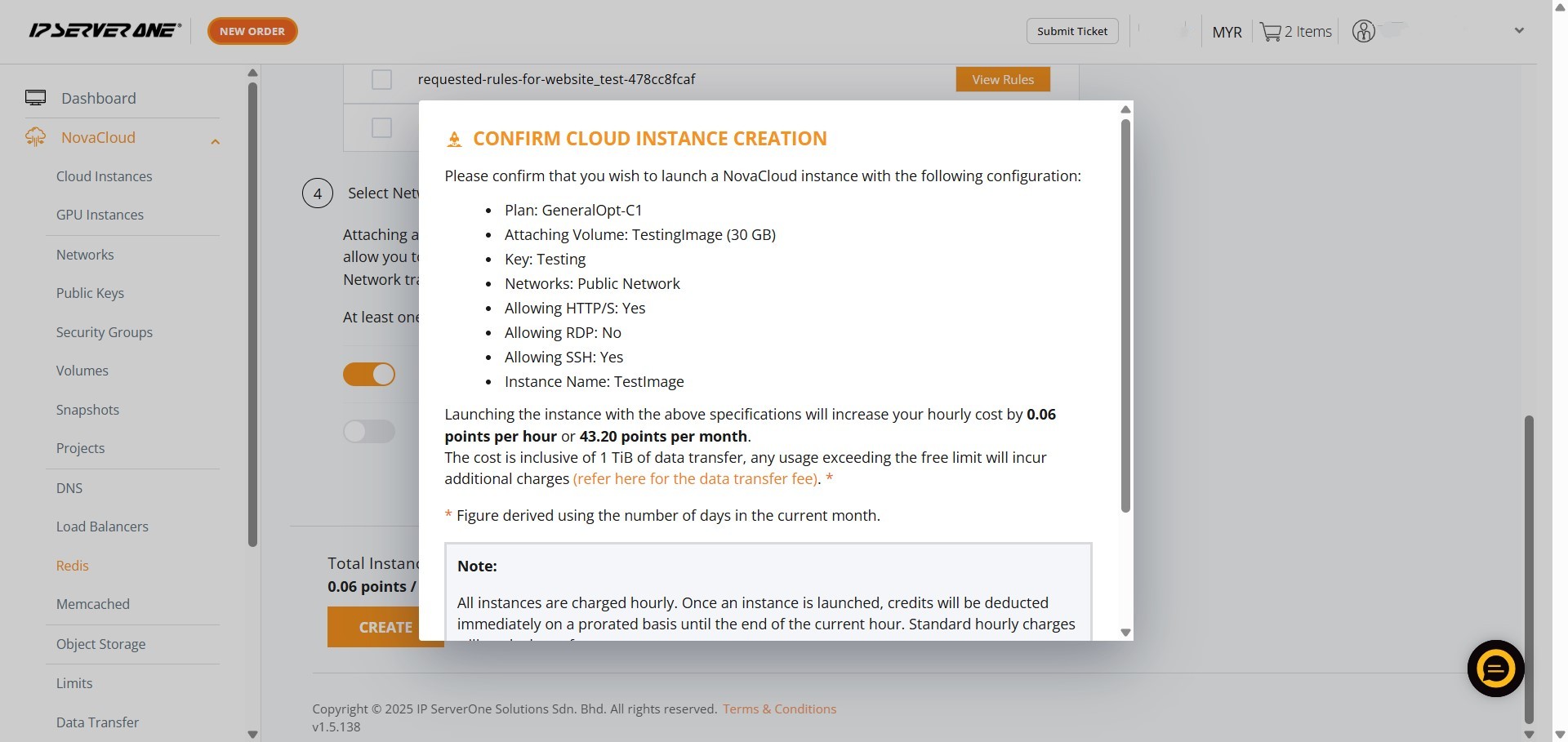 - A “CONFIRM CLOUD INSTANCE CREATION” pop-up will appear.