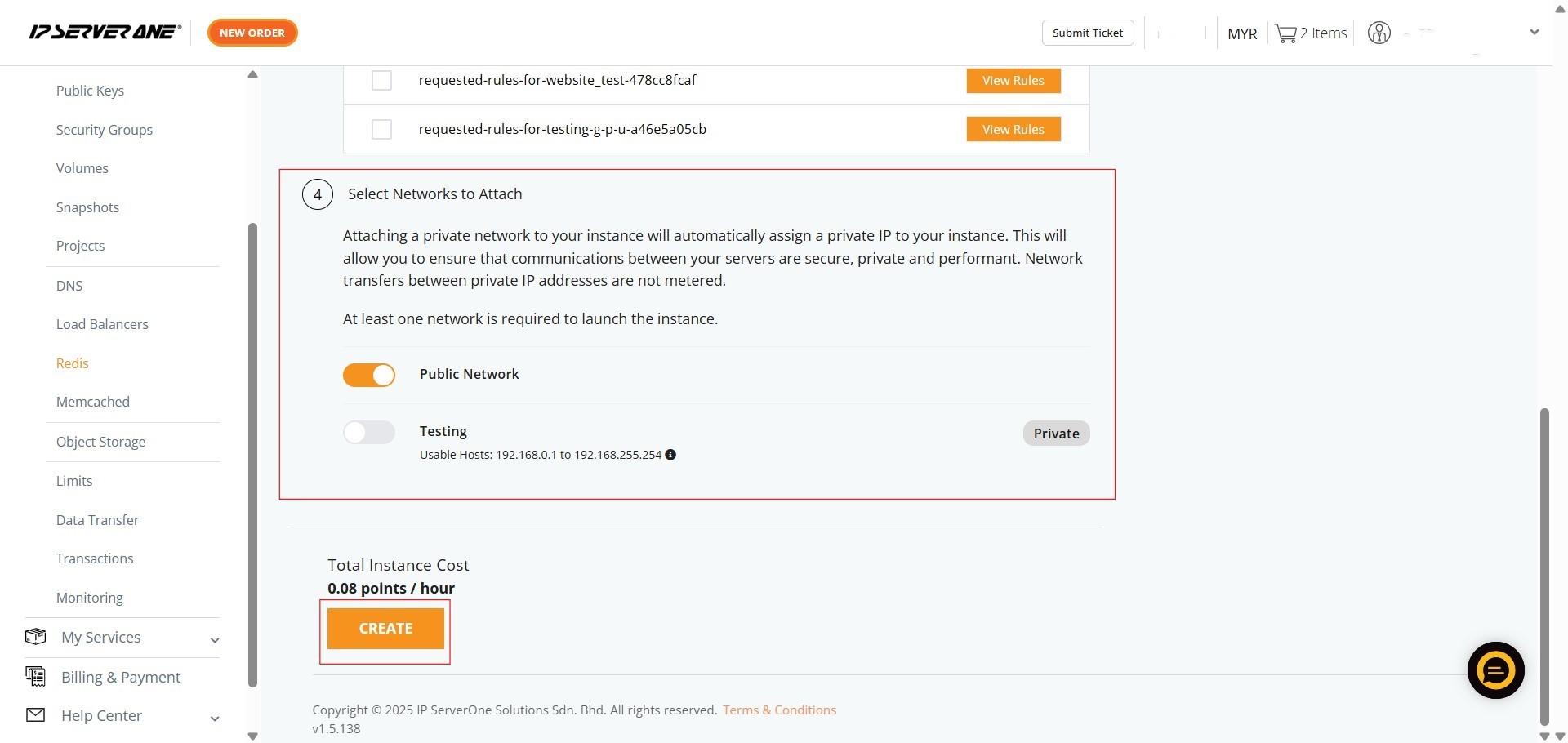 - Select the network(s) to attach to your instance. A Public Network is usually enabled by default, and you may also choose to attach a Private Network for secure communication between your servers. At least one network is required to launch the instance. After making your selections, click “Create”.