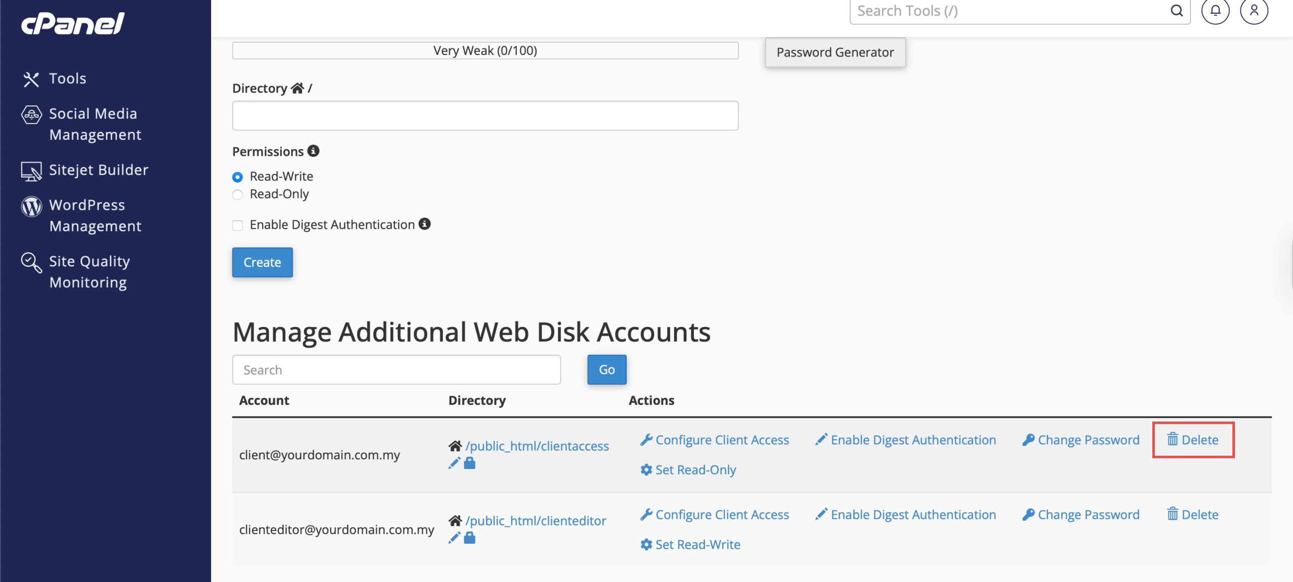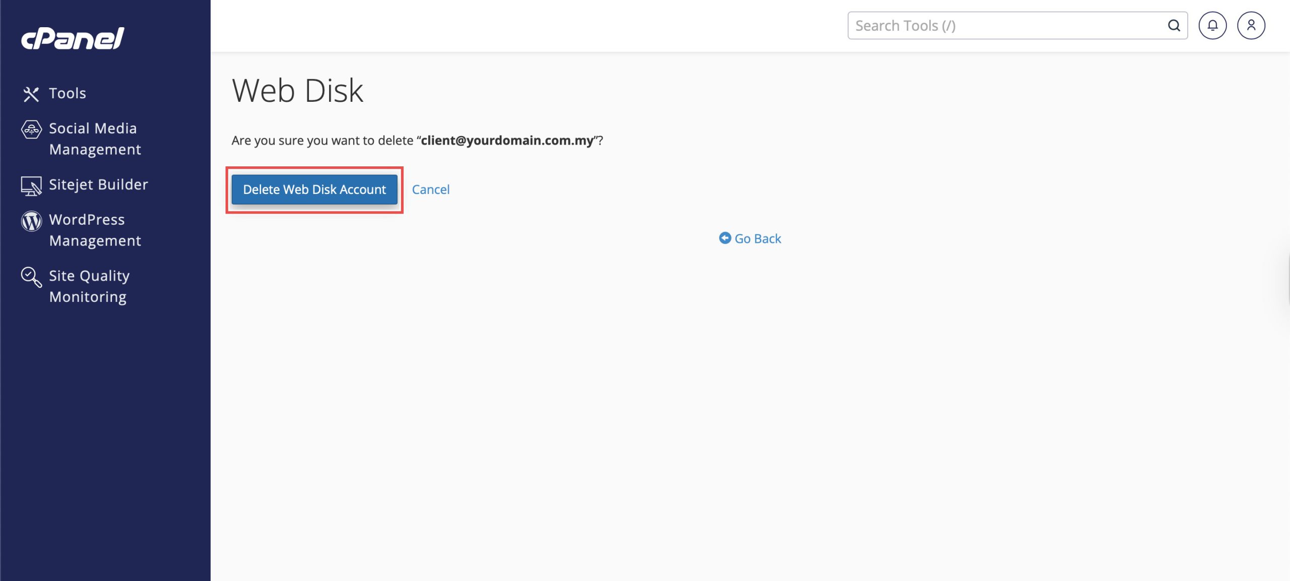 Locate the Web Disk account you wish to delete, and click Delete. You will be prompted again for confirmation, click Delete Web Disk Account.