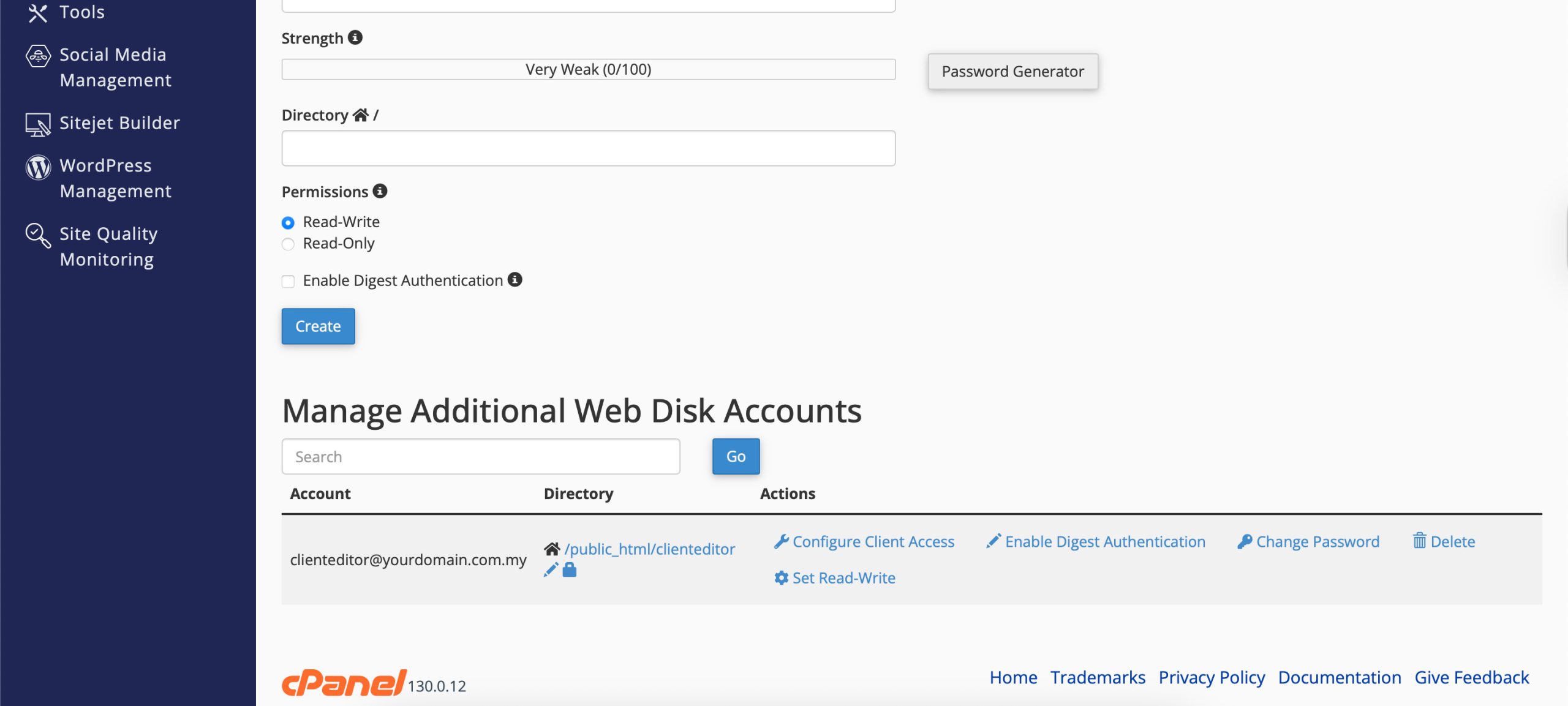 Managing Web Disk accounts includes removing unnecessary or obsolete accounts to maintain organized access control and security. When team members leave, projects end, or access requirements change, deleting unused Web Disk accounts helps prevent unauthorized access while keeping your account list manageable. cPanel’s Web Disk interface provides a secure method for removing additional accounts while preserving the underlying files and directories. This guide explains how to delete Web Disk accounts using the Files > Web Disk section in cPanel.