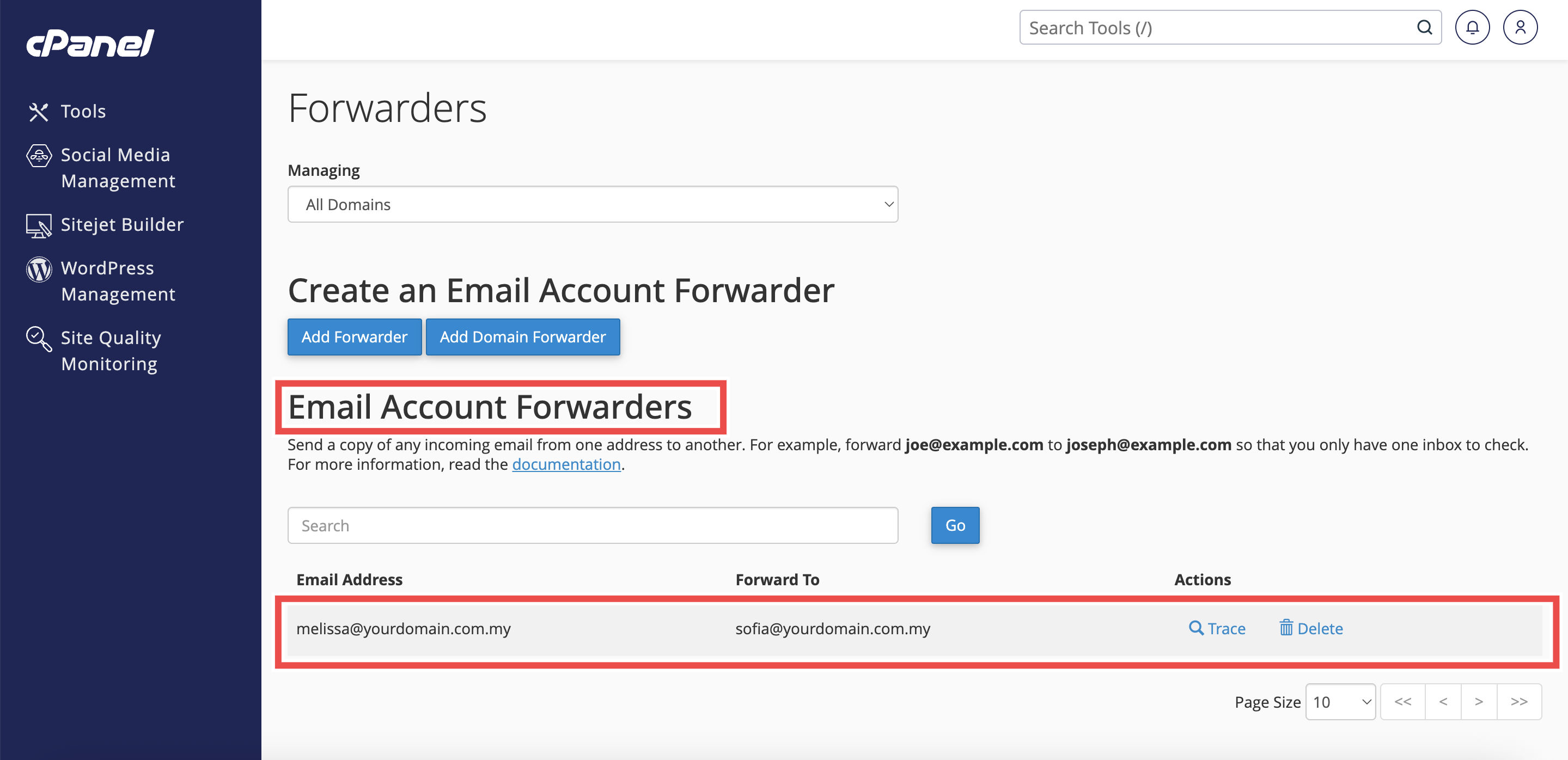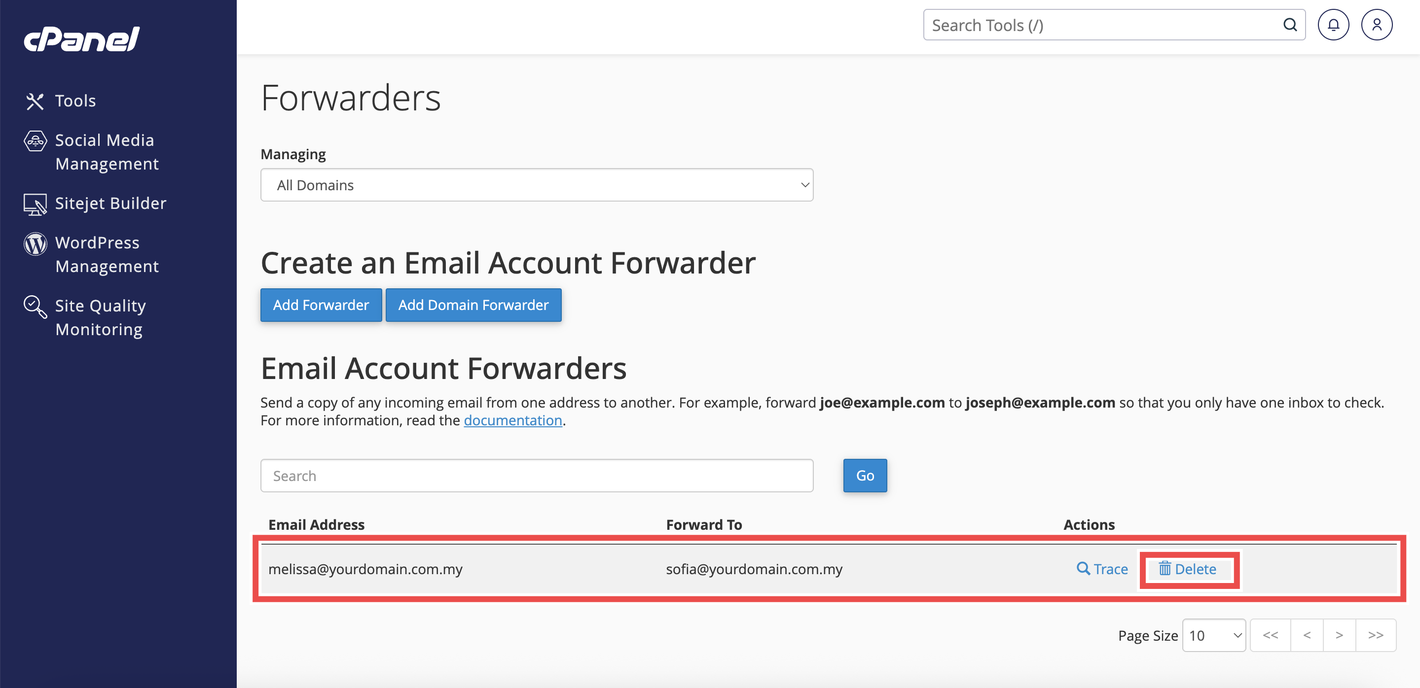 By following these steps, you can quickly delete an unwanted email forwarder in cPanel. This helps you keep your email settings organized and ensures only necessary forwarding rules remain active.