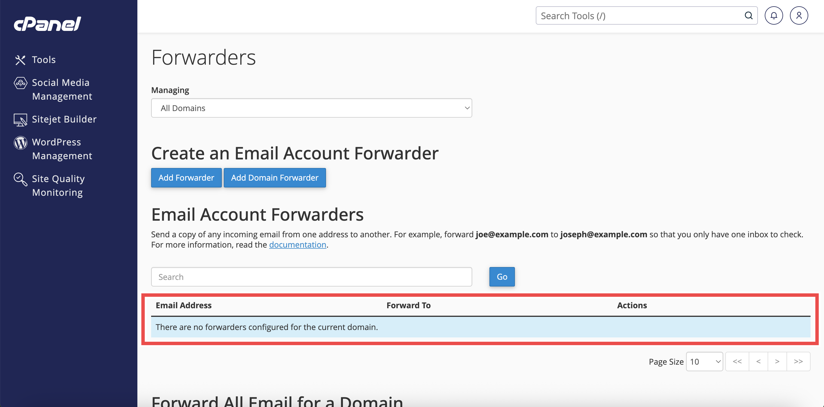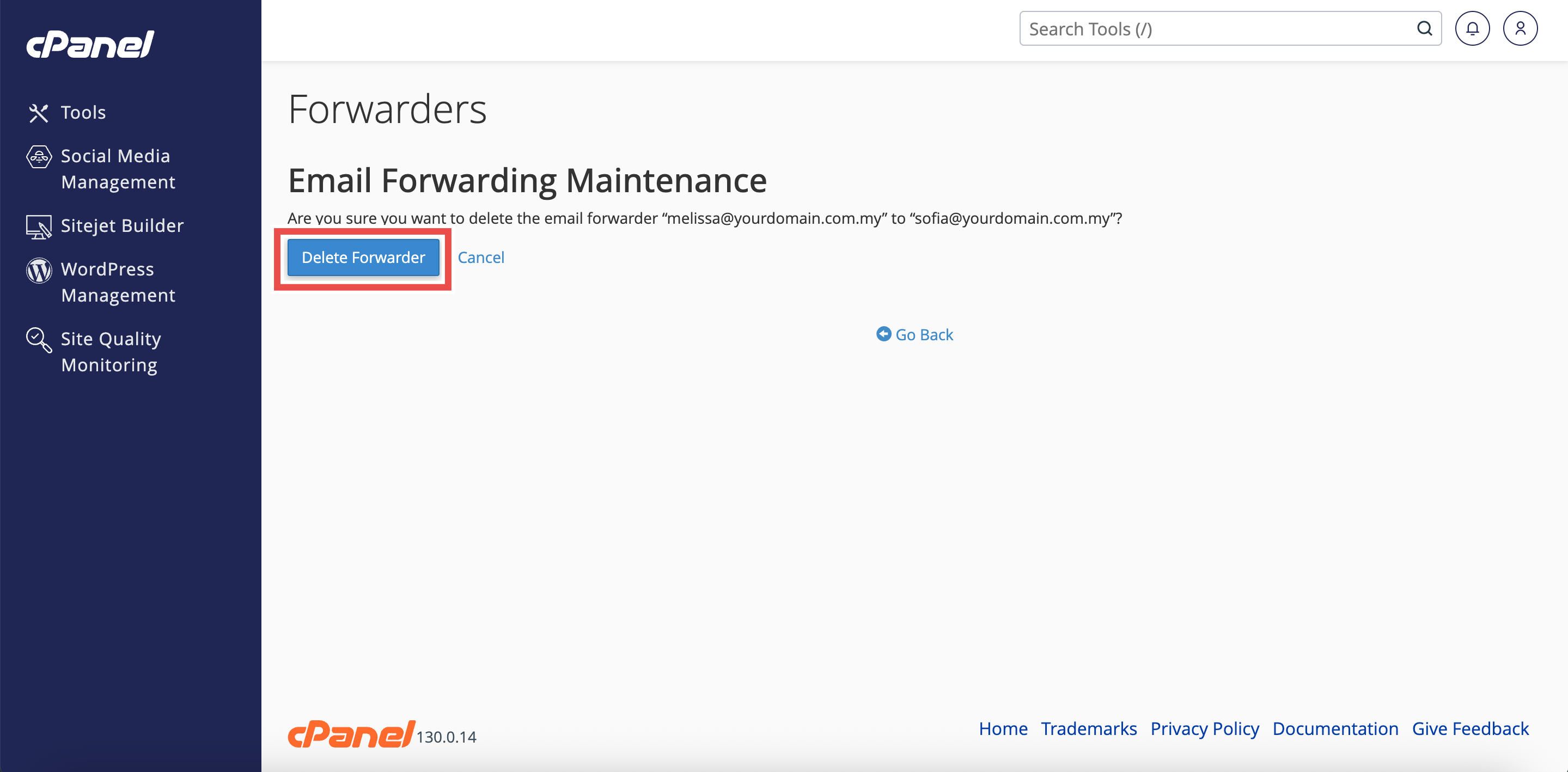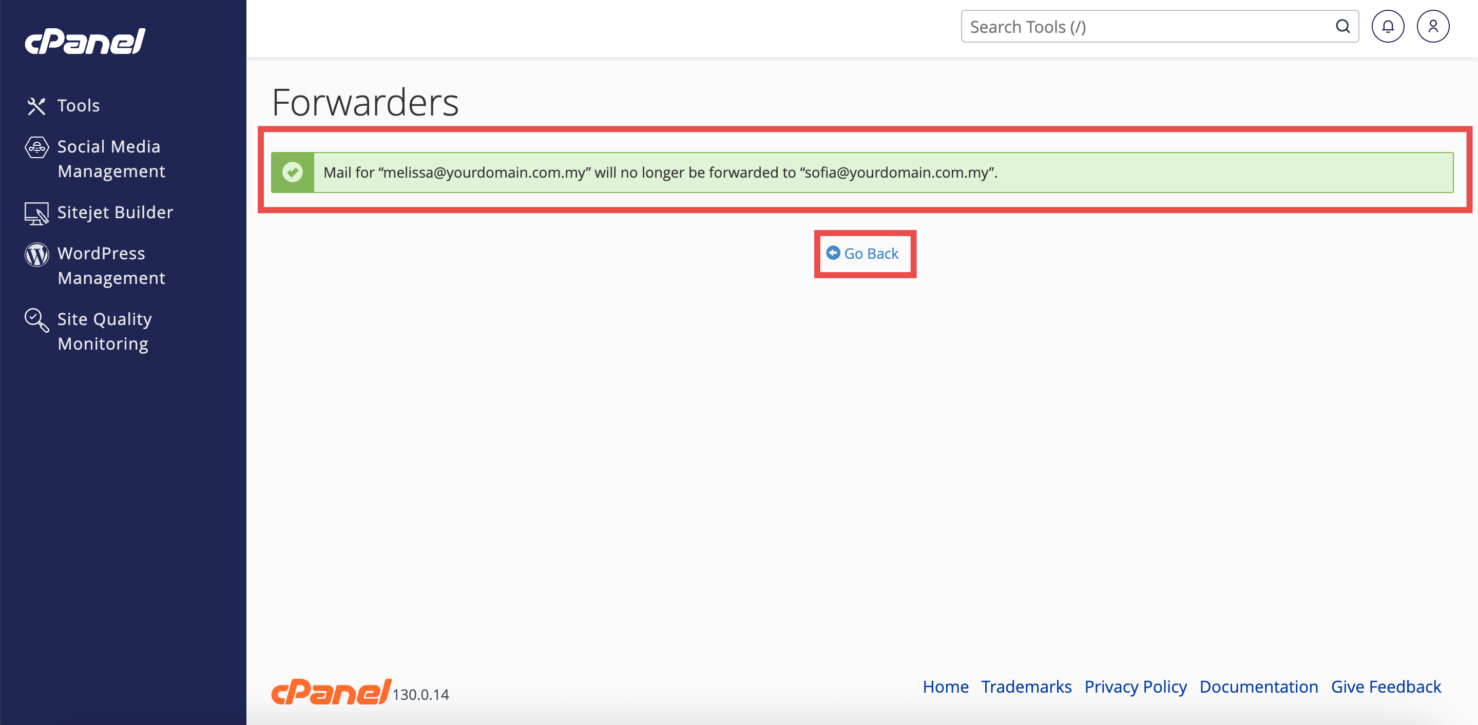 - Click Go Back to verify the forwarder is no longer listed in the Email Account Forwarders table.